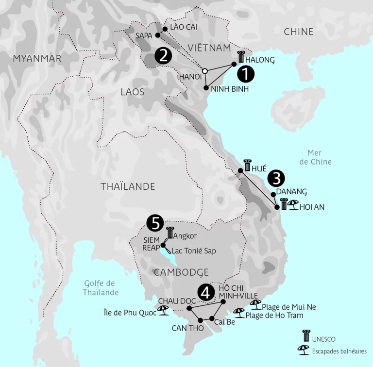 Vivez un voyage façonné par vos envies : choisissez les étapes qui vous inspirent le plus, dans l’ordre qui vous convient et aux dates qui vous ressemblent. Laissez-vous séduire par la magie de la baie d’Halong, les rizières en terrasses de la région de Sapa, le charme de Hué et Hoi An, ou encore la douceur du delta du Mékong, avant de prolonger l’aventure jusqu’aux temples majestueux d’Angkor au Cambodge. Accordez-vous une parenthèse balnéaire méritée pour clore votre voyage. Un périple à votre rythme qui vous invite à découvrir le Viêtnam sous toutes ses facettes, ou vous concentrer sur celles que vous souhaiterez explorer.