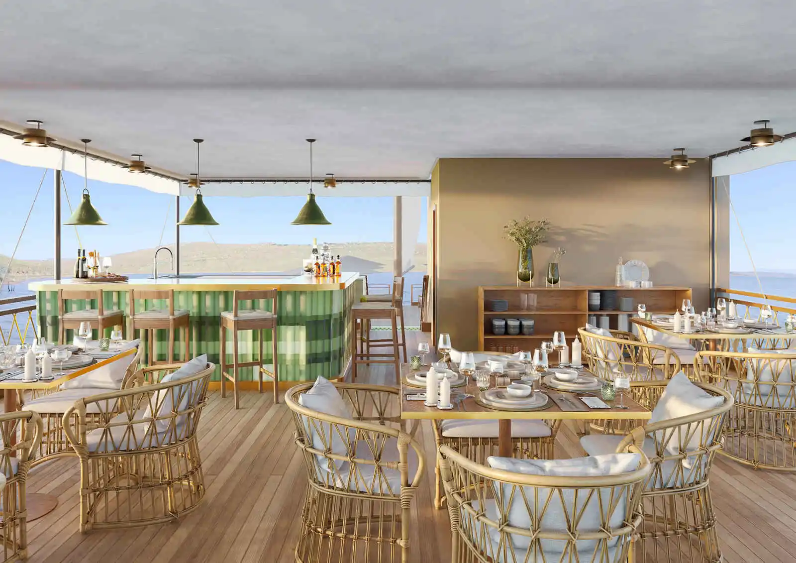 Votre embarcation possède 2 salles à manger dont une extérieure avec bar proposant des boissons alcoolisées ou non. Cuisine traditionnelle et internationale élaborée le plus possible à partir d’ingrédients locaux.