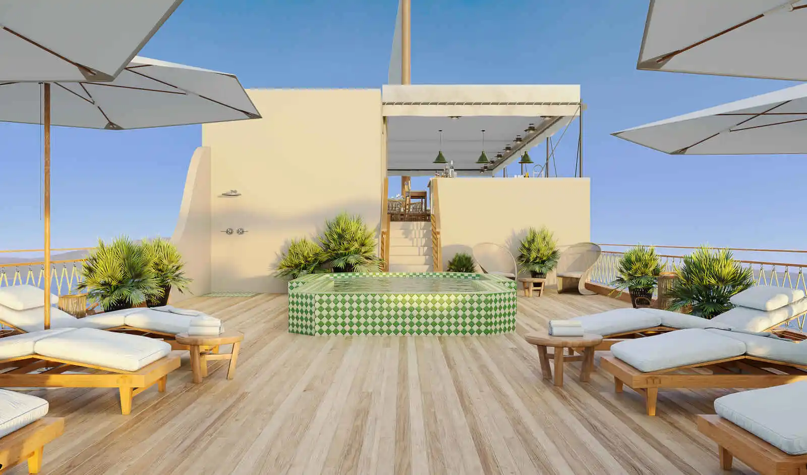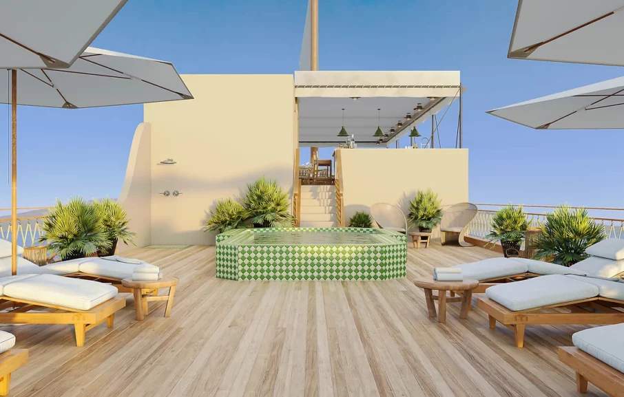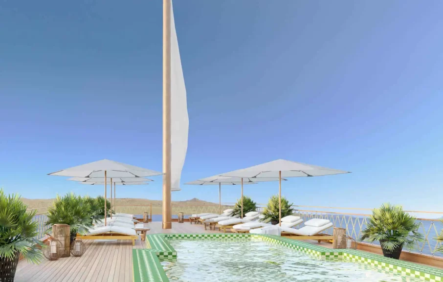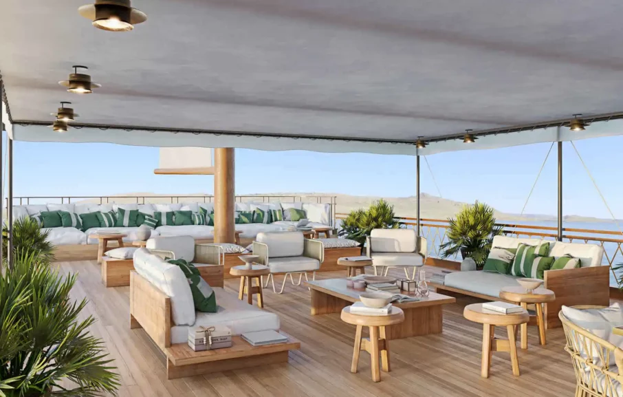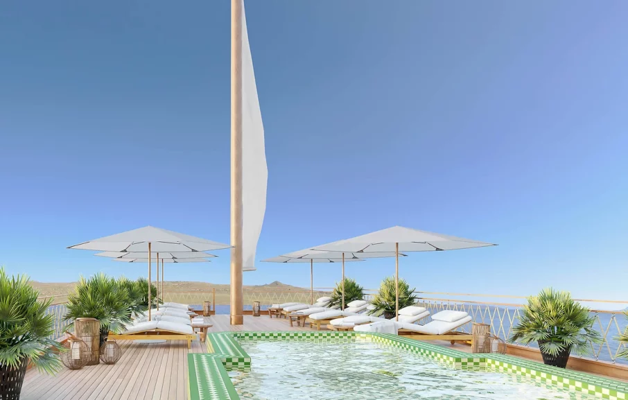 - Le 3ème pont panoramique invite à la contemplation depuis le salon ombragé, la petite piscine et son solarium aménagé de confortables transats.