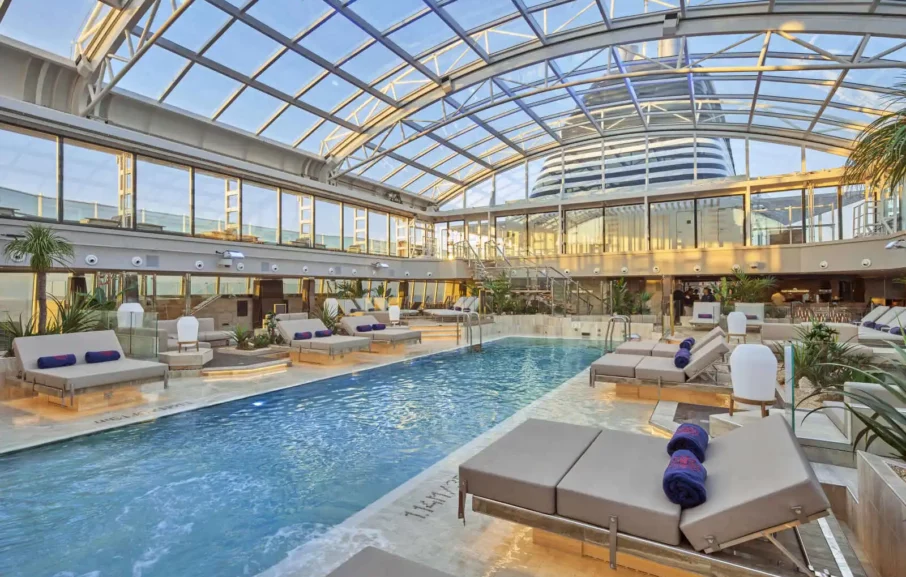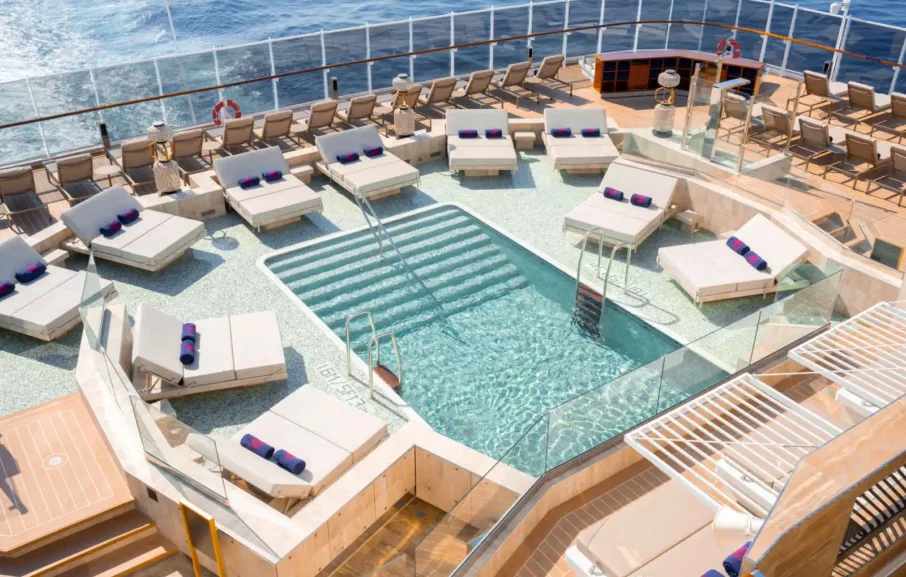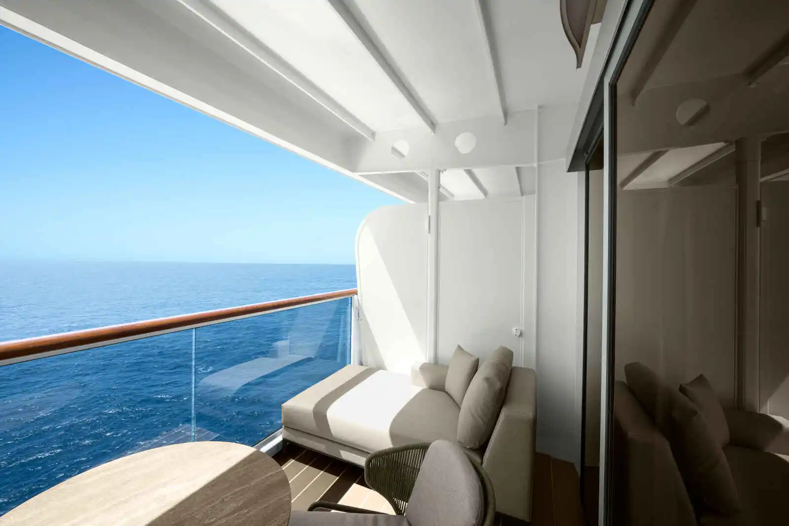 Les navires proposent 461 suites dotées de larges portes-fenêtres offrant un intérieur lumineux et de belles terrasses privatives avec table, chaises et transat :