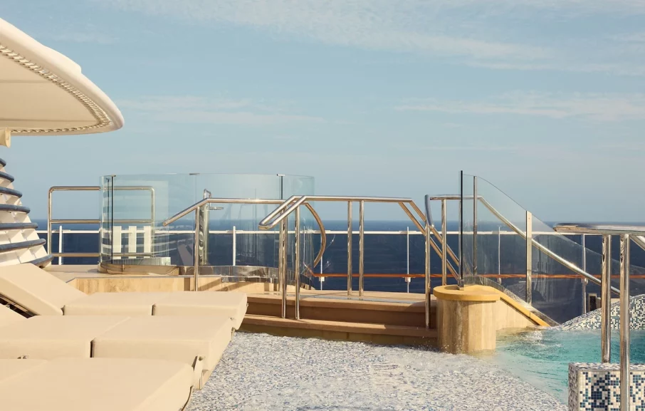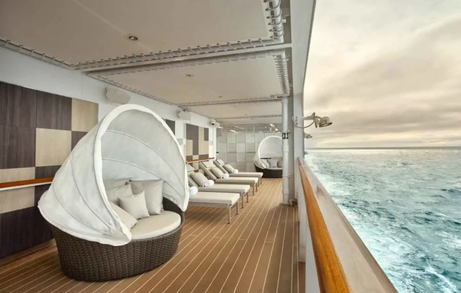 Les navires proposent 461 suites dotées de larges portes-fenêtres offrant un intérieur lumineux et de belles terrasses privatives avec table, chaises et transat :