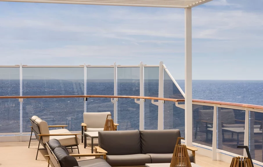 Les navires proposent 461 suites dotées de larges portes-fenêtres offrant un intérieur lumineux et de belles terrasses privatives avec table, chaises et transat :