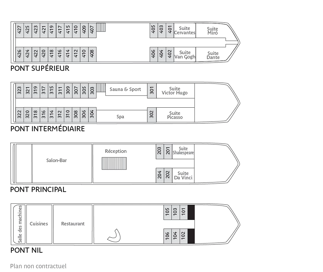 Les 66 cabines et suites confortables disposent d’une climatisation individuelle, télévision, grande baie vitrée, salle de bains avec douche ou baignoire. Les suites disposent également d’un sauna individuel.
