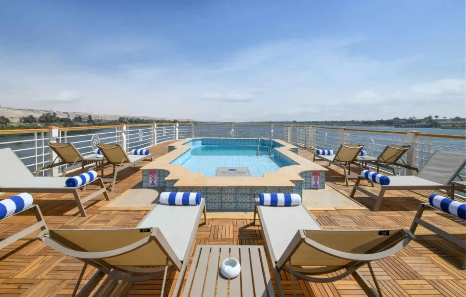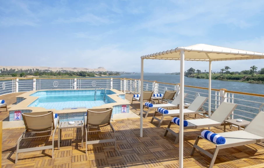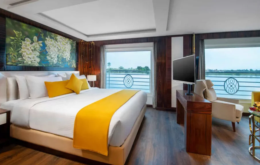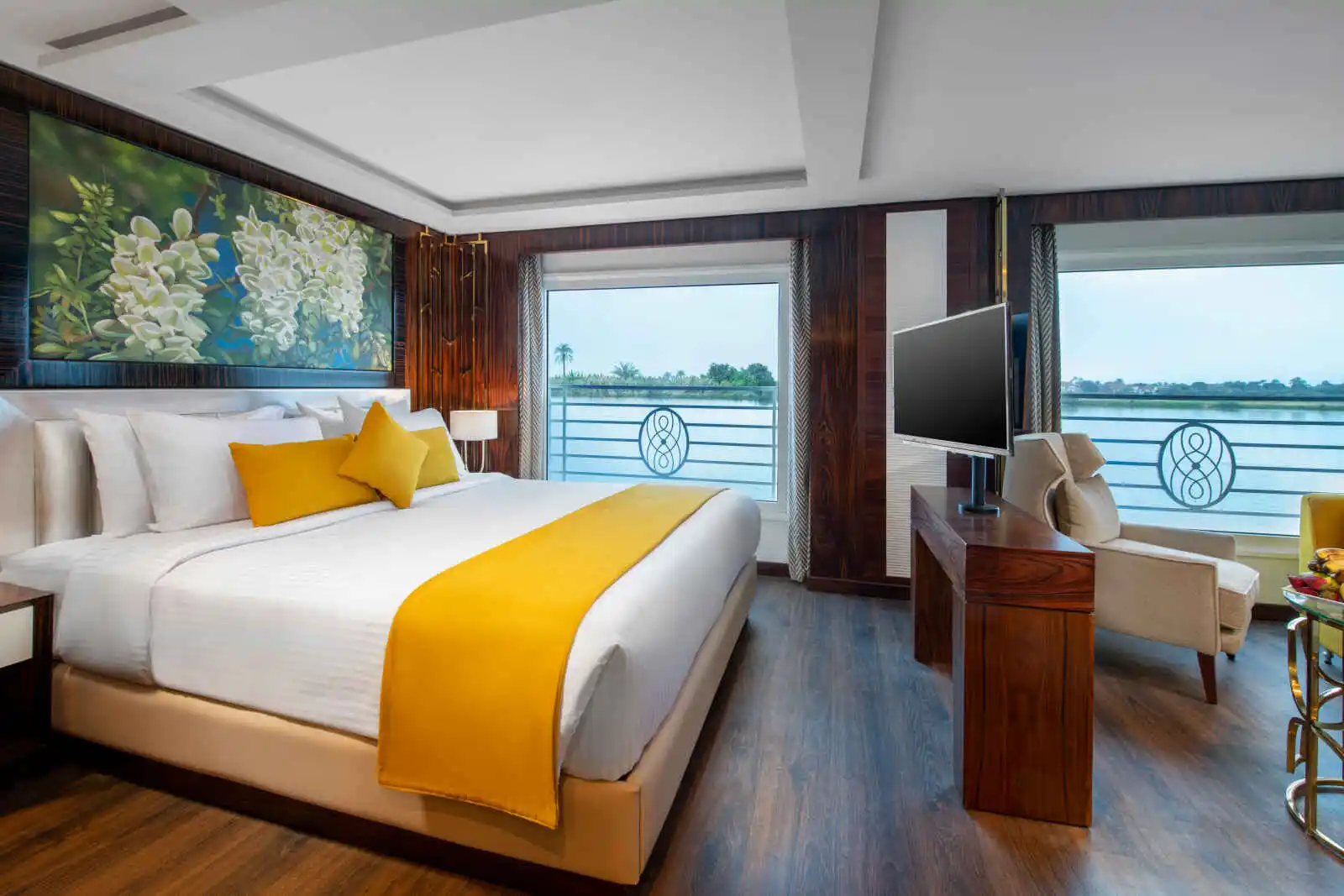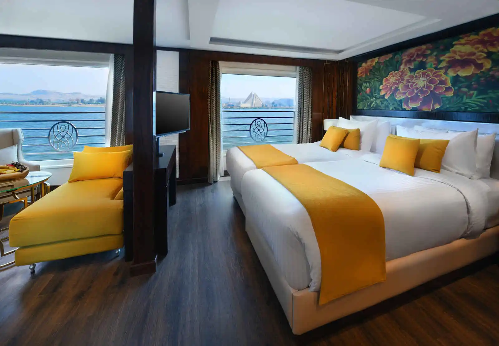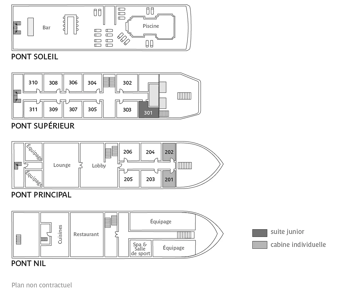- Les cabines doubles situées sur le pont principal sont équipées de 2 lits simples alors que les cabines du pont supérieur sont équipées d’1 lit double.