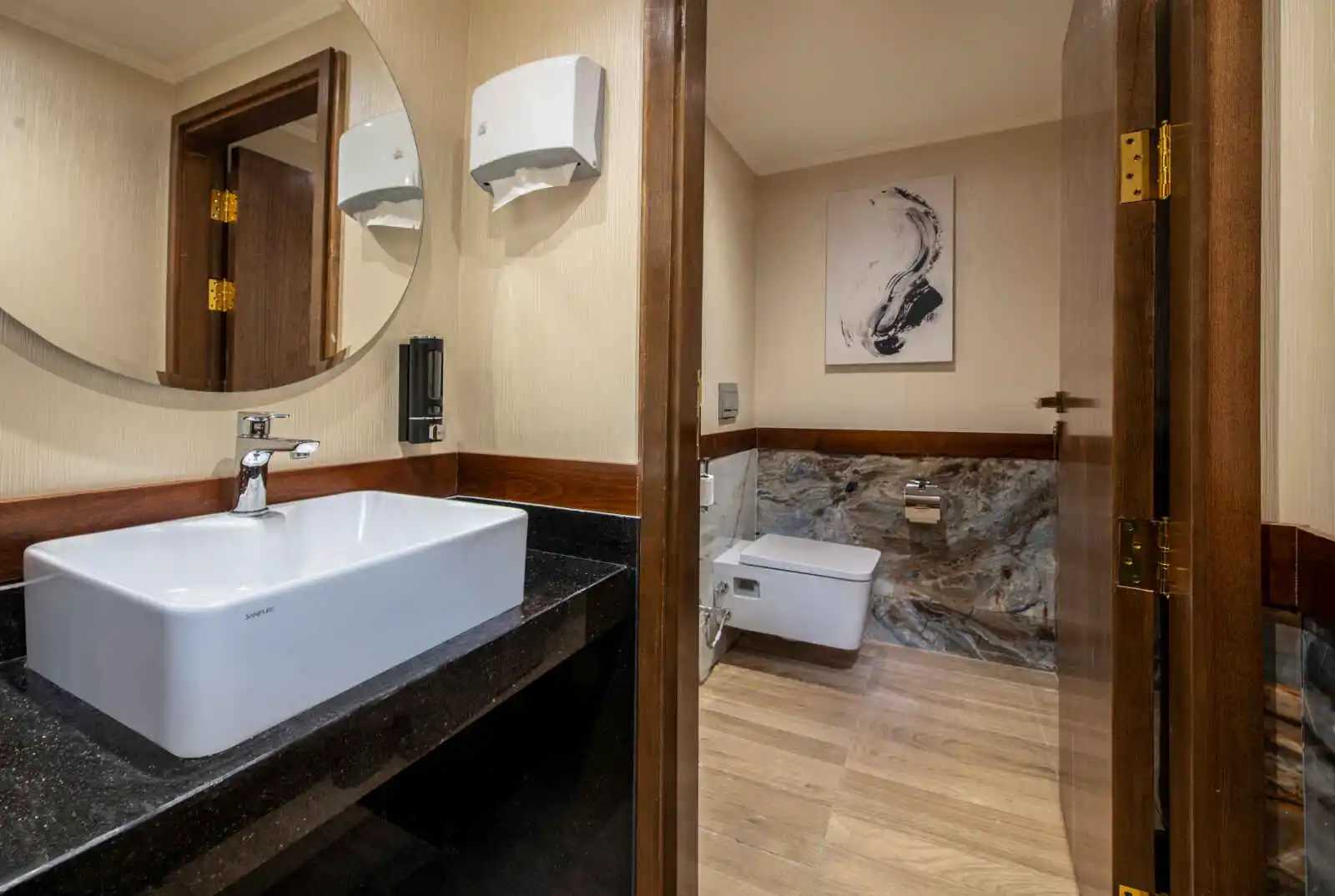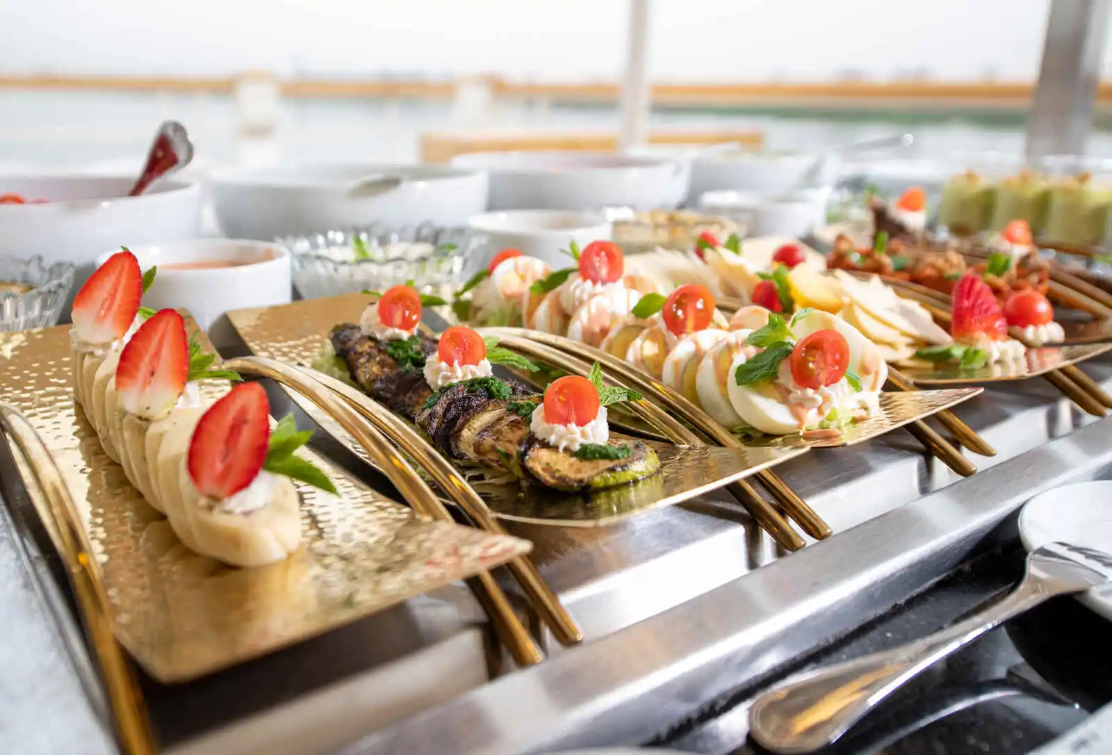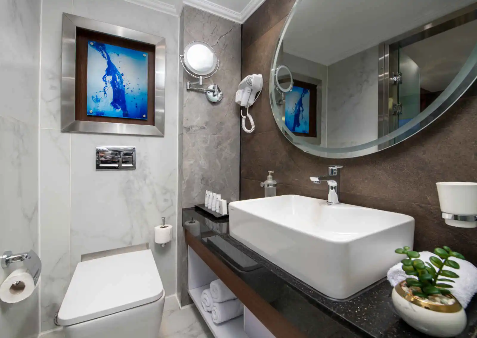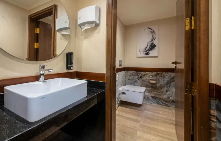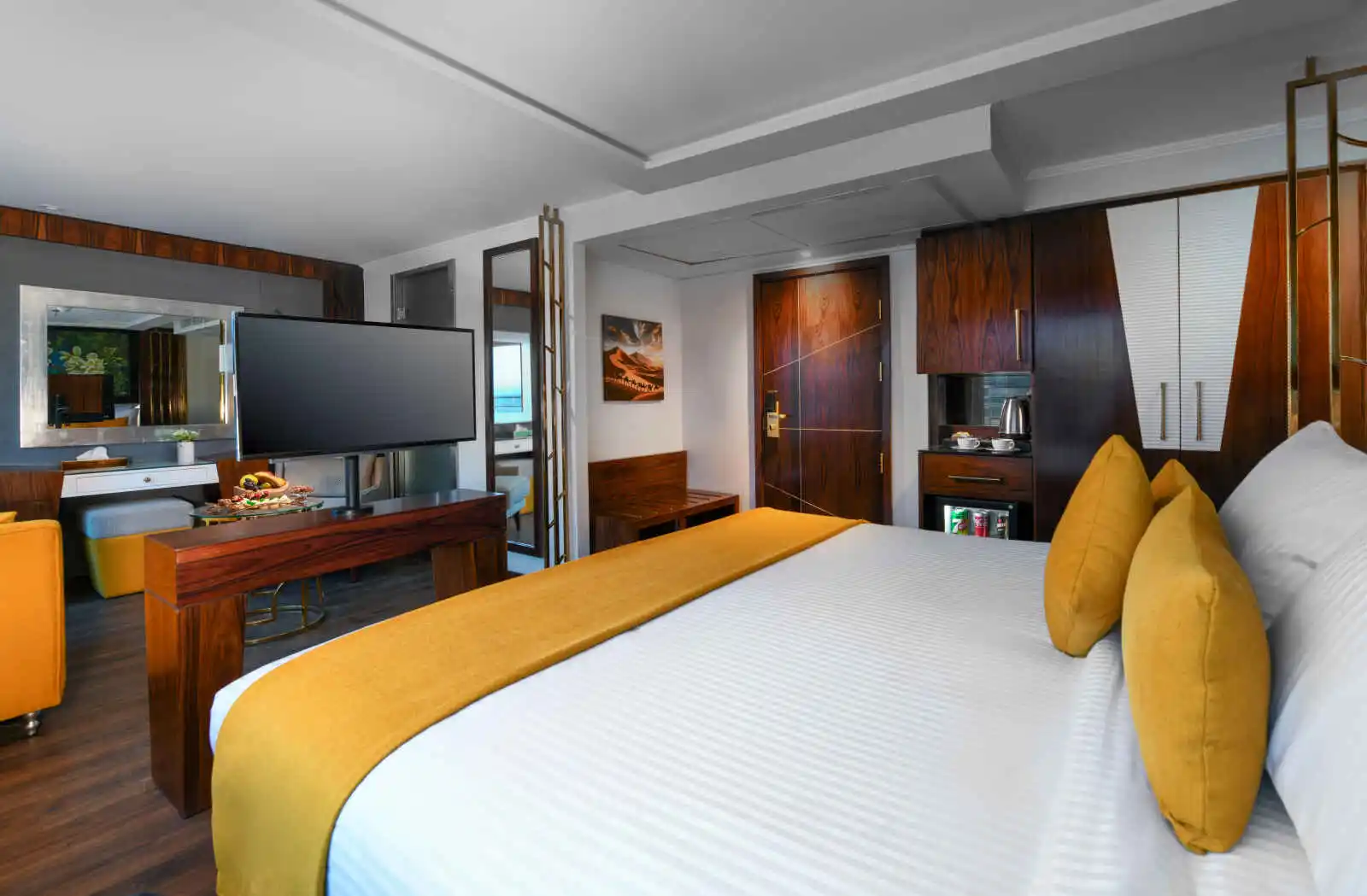 - Les cabines doubles situées sur le pont principal sont équipées de 2 lits simples alors que les cabines du pont supérieur sont équipées d’1 lit double.