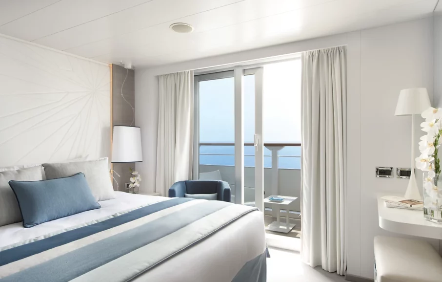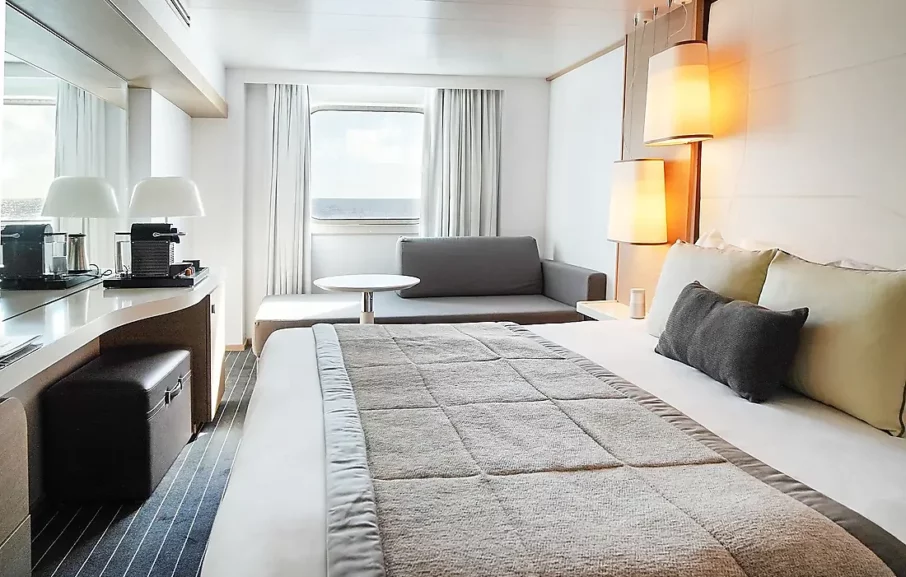 et peignoirs, minibar, machine à café Nespresso® et bouilloire, coffre-fort électronique, enceinte Bluetooth Bose®, service en cabine ou suite 24 h/24 et accès Internet WiFi illimité gratuit. Pour les passagers voyageant en suite sur le pont 6, un majordome sera à votre disposition.