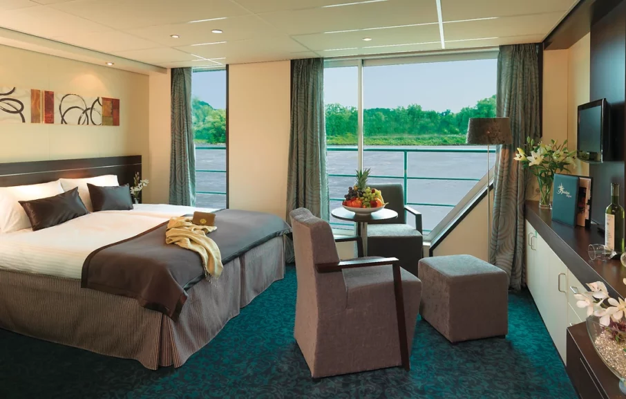 Desservies par un ascenseur, les cabines réparties sur 3 ponts sont toutes extérieures. Elles disposent d’un ameublement moderne, très confortable et offrent une décoration raffinée aux tons chaleureux. Les cabines doubles ont une superficie de 15 m2 et les suites deluxe de 22 m2. Sur les ponts supérieur et panorama, les cabines disposent d’une large baie vitrée qui s’ouvre. Sur le pont principal, elles disposent d’une fenêtre (qui ne s’ouvre pas). Toutes les cabines sont équipées d’une salle de bains avec douche, d’une télévision, de la climatisation individuelle, d’un téléphone, d’un sèche-cheveux et d’un coffre-fort. Les suites deluxe disposent également d’un coin salon et d’un mini-bar.