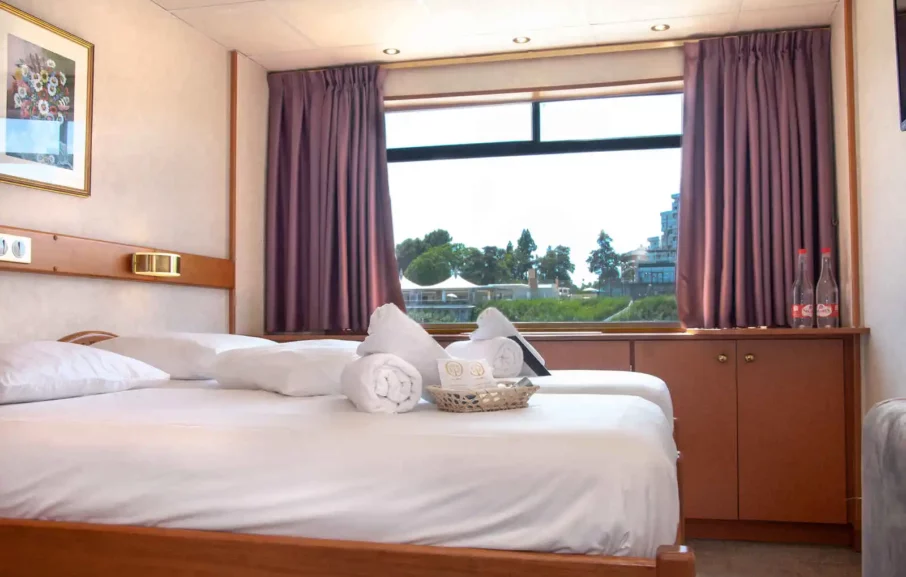 Sur le bateau, les cabines de 11 à 13 m2 vous permettront de vous détendre sans manquer la vue sur les nuances de bleu grâce à une vue époustouflante. Elles sont toutes équipées de téléviseurs et d’un système de climatisation pour se rafraîchir pendant les étés méditerranéens.