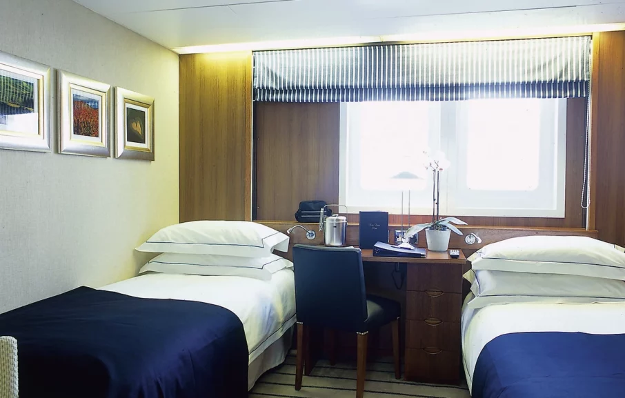 206 cabines : 158 extérieures (dont 2 grandes suites et 4 suites junior) avec hublot ou grand sabord et 48 intérieures. Elles sont toutes spacieuses et de très bon confort. Toutes sont équipées de :