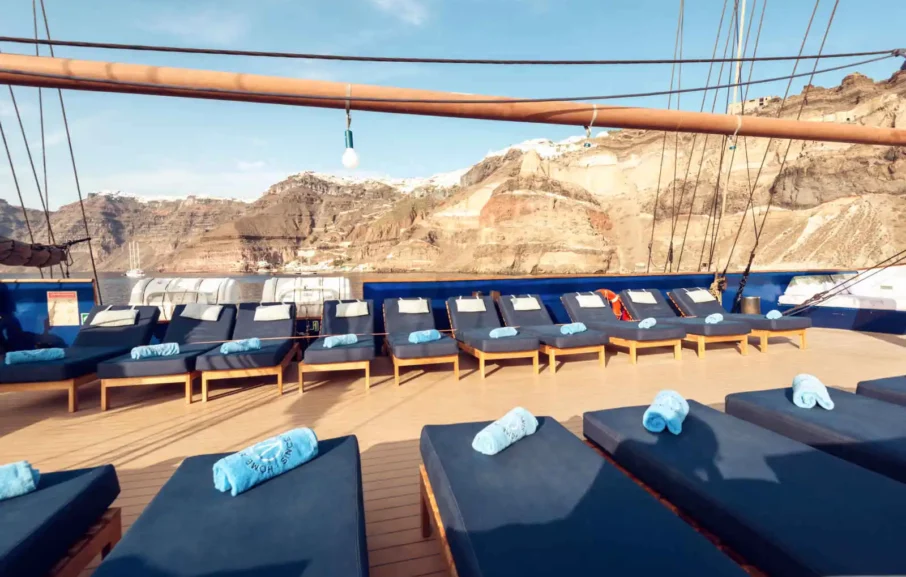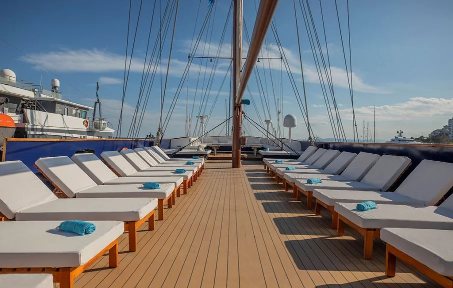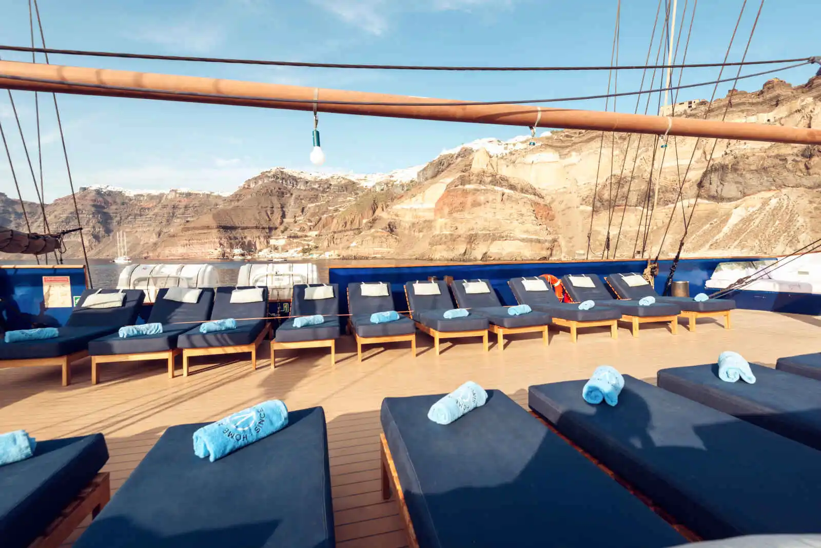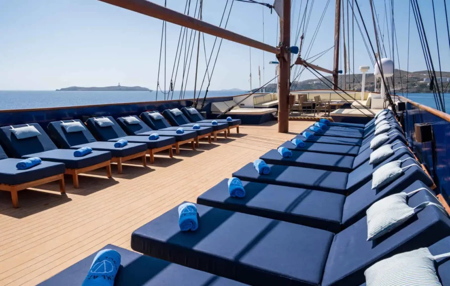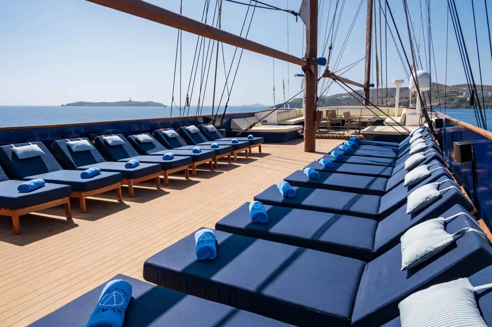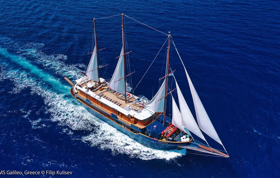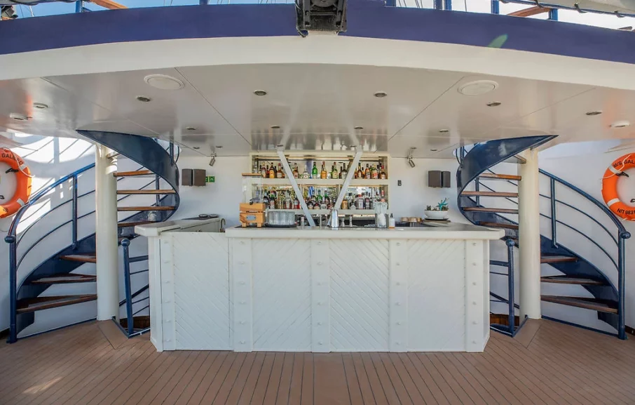 - Ce navire est un bateau à voile motorisé doté de trois mâts. Il navigue toujours sous motorisation, mais peut occasionnellement sortir les voiles si le temps le permet.
