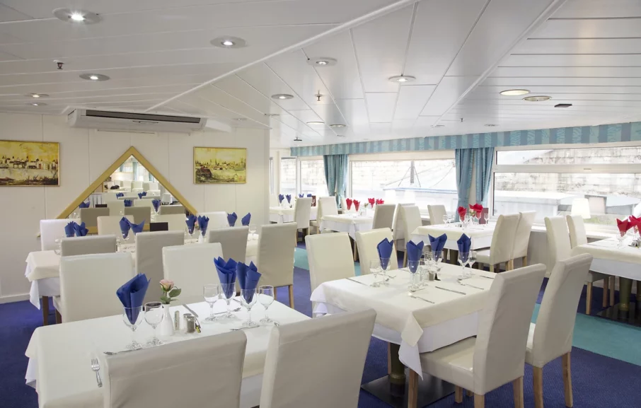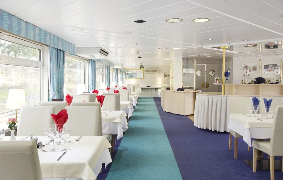 Le M/S Petit Prince possède un vaste restaurant panoramique situé sur le pont supérieur, où une cuisine variée et de qualité vous sera proposée tout au long du voyage. Un seul service de restauration avec eau, thé ou café inclus à chaque repas.