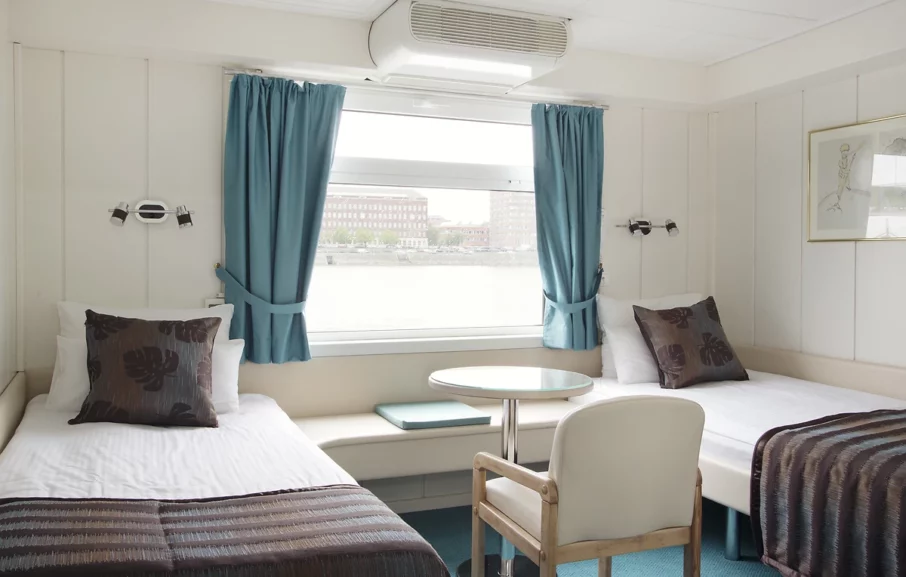 Les 43 cabines, réparties sur les deux ponts, sont toutes extérieures. Disposant d’un ameublement moderne et confortable, elles sont équipées de 2 lits séparés (non rapprochables), d’une salle d’eau avec douche, d’une télévision, de la climatisation individuelle, d’un téléphone interne, d’un sèche-cheveux et d’un coffre-fort. D’une superficie d’environ 16 m², les cabines possèdent une fenêtre panoramique ouvrable.