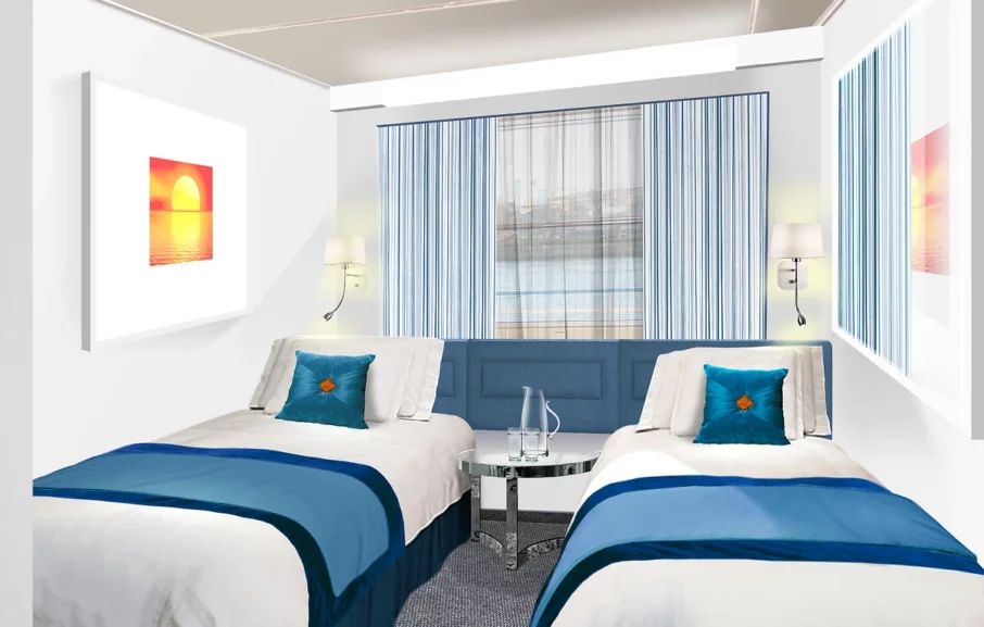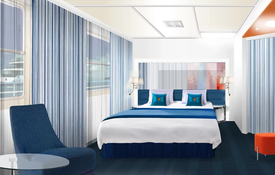 Toutes les cabines et suites sont agencées avec des tons pastel, dans un cadre épuré et disposent d’une ou deux fenêtres donnant sur l’extérieur.
