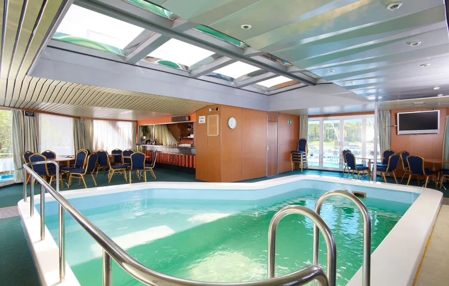 Laissez-vous charmer par la piscine intérieure et ses grandes baies vitrées par lesquelles vous pourrez contempler entre deux longueurs, le merveilleux panorama. Le M/S Tchekhov dispose également d’une salle de conférence moderne et équipée pour les interventions de notre conférencier qui vous fera partager sa passion de l’histoire et de la civilisation russes. Vous trouverez aussi une petite boutique de souvenirs ainsi que des produits de première nécessité, une petite salle de lecture, un pont soleil parfait pour admirer les couchers de soleil sur la Volga. Une connexion WiFi est gracieusement mise à disposition. Thé et café sont en libre-service à bord.