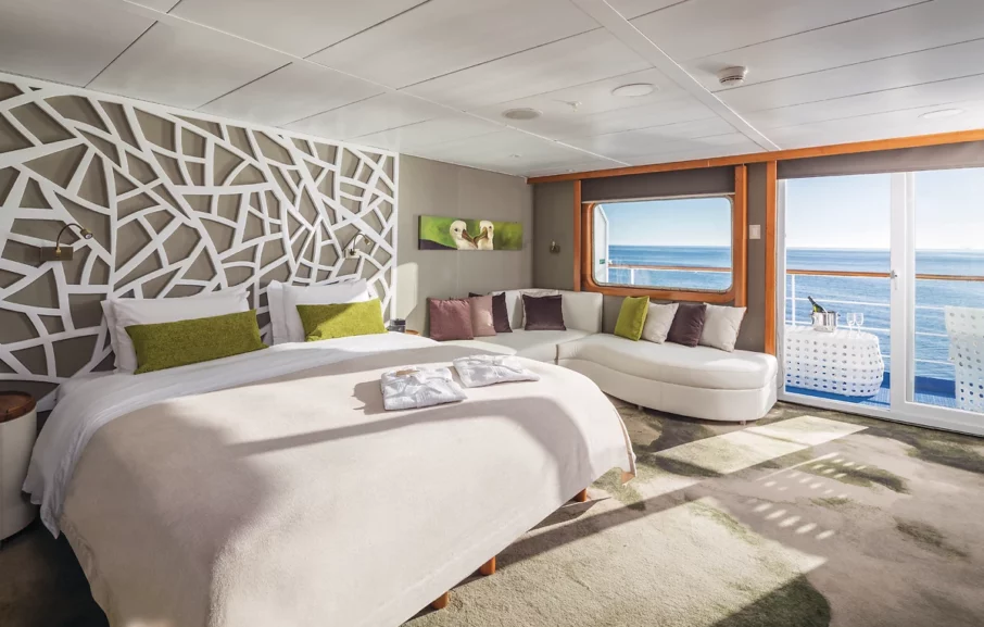 Suite Legend avec balcon (33 m²) sur le pont Moon. D’autres cabines plus petites également disponibles (standard et standard plus).