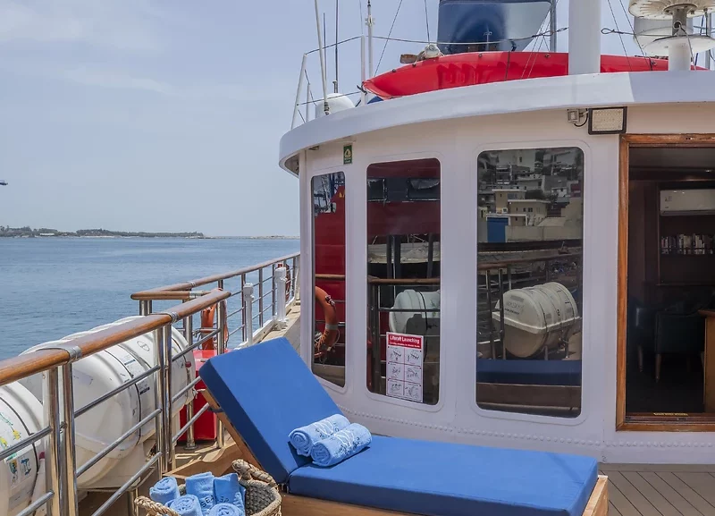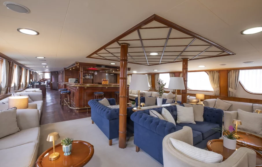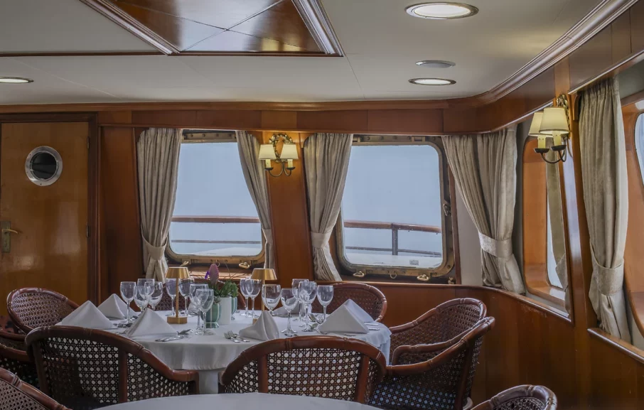 Le M/Y Callisto dispose de 17 cabines extérieures sur les ponts inférieur et principal, toutes climatisées et aménagées avec soin. Elles sont dotées d’une salle de douche avec sèche-cheveux, d’un mini-réfrigérateur, d’une télévision et d’un coffre.