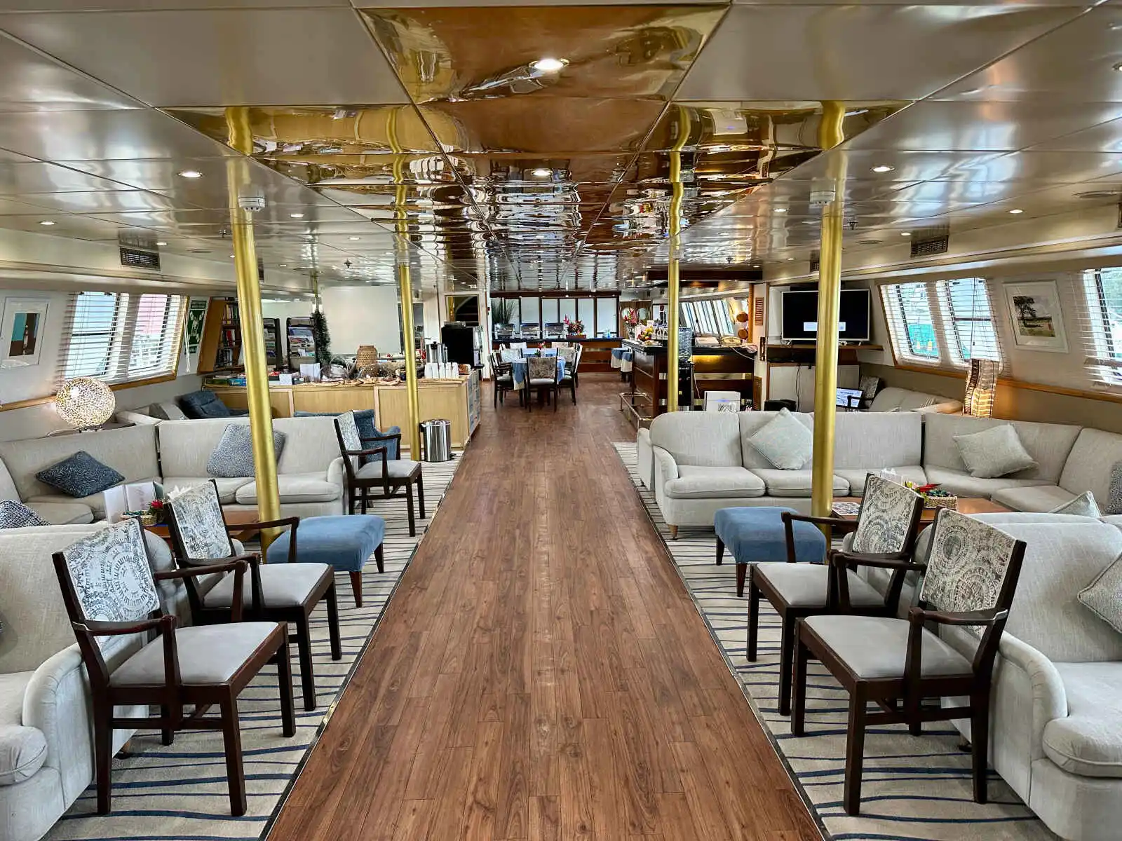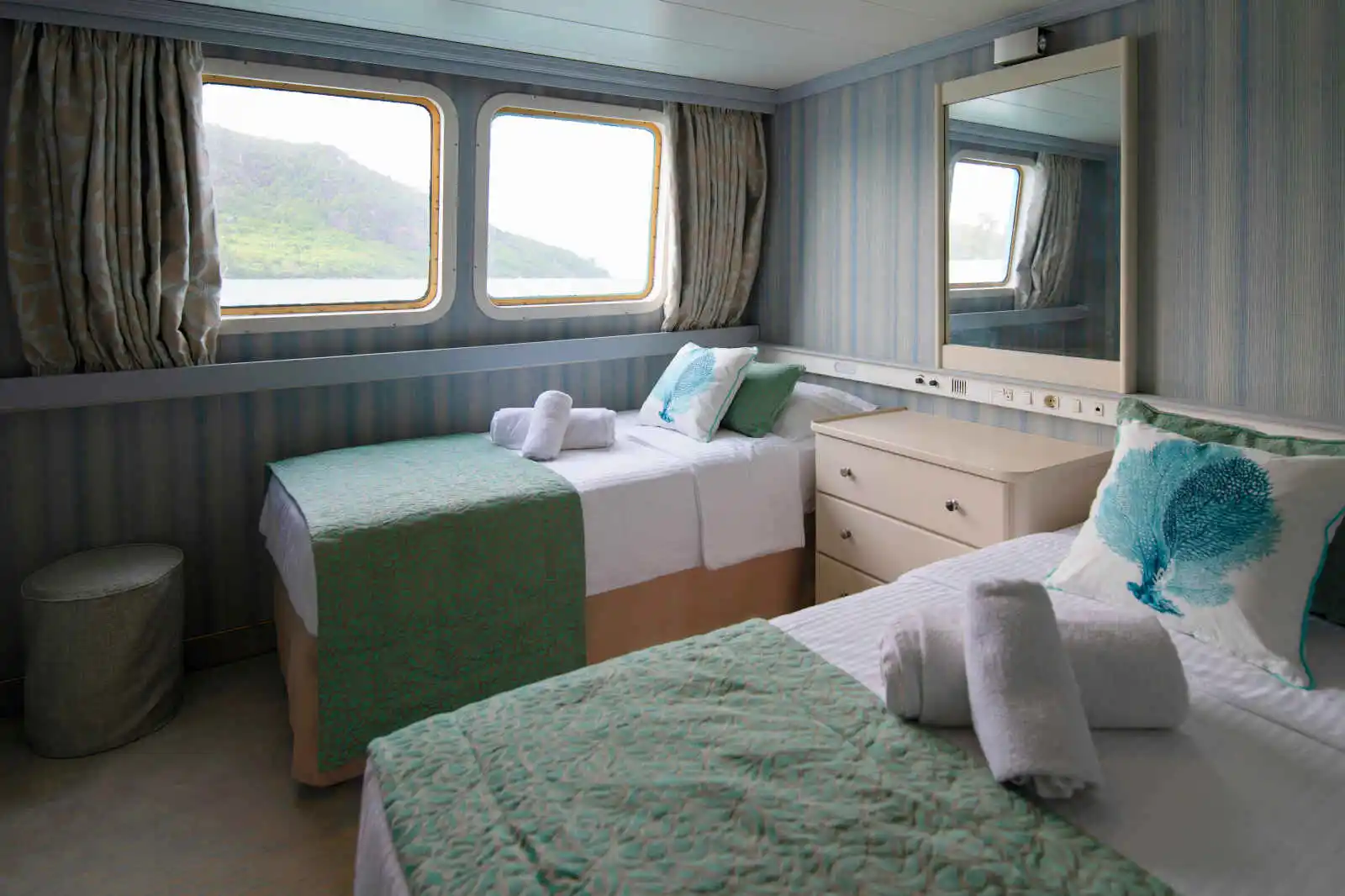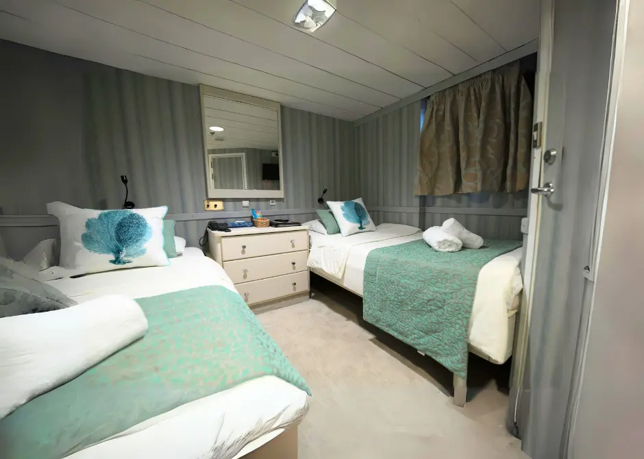 Les 21 cabines disposent d’une salle de douche avec toilettes, d’un sèche-cheveux, d’une large fenêtre, de l’air conditionné individuel, d’un coffre-fort, d’une télévision (chaînes locales uniquement) et d’un mini-réfrigérateur. Décorées dans des tons pastel, elles sont spacieuses et confortables. Deux cabines se déclinent en version triple.