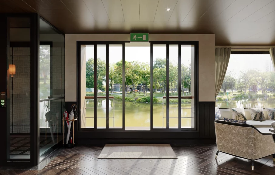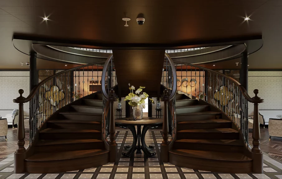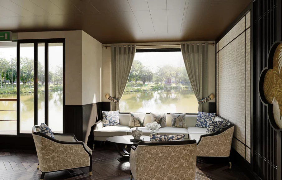 - 2 suites de l’armateur (60 m2) sur le pont panorama, avec une large baie vitrée et un balcon privé, une salle de bain dotée d’une douche à l’italienne et d’une baignoire ouverte sur le Mékong, un salon séparé et un lit King size.
