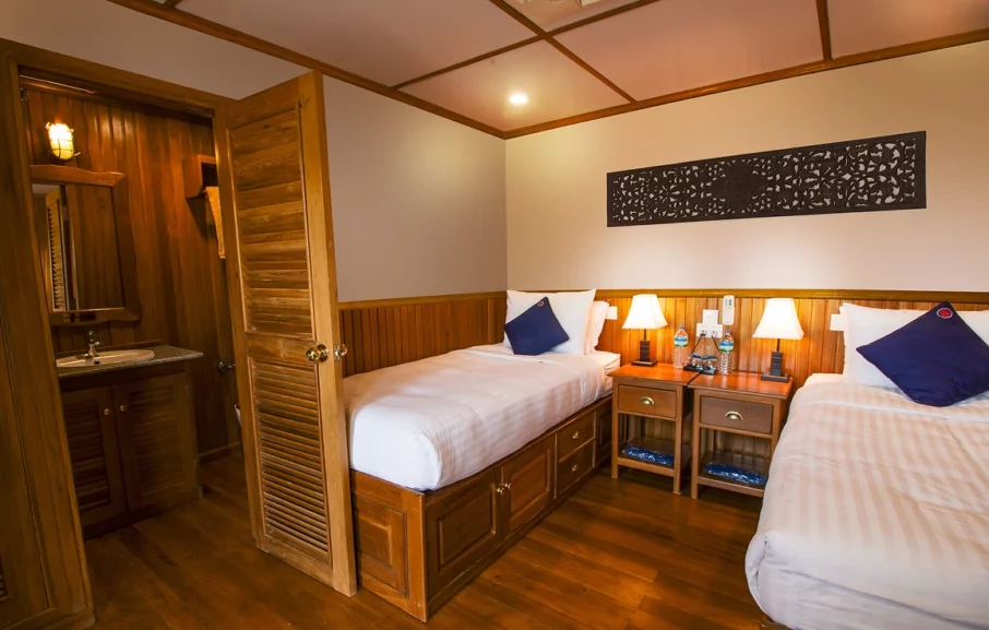 Le R/V Sabei Pandaw dispose de 8 cabines sur le pont principal et de 6 cabines sur le pont supérieur. Chaque cabine, de 13 à 15 m², est climatisée et équipée de baies vitrées, de lits doubles ou simples, d’une salle de bains avec toilettes, d’une penderie, d’un sèche-cheveux, d’un petit coffre-fort.