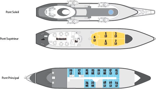 Les 17 cabines sont toutes extérieures et disposent d’une télévision à écran plat permettant de suivre la navigation en temps réel.
