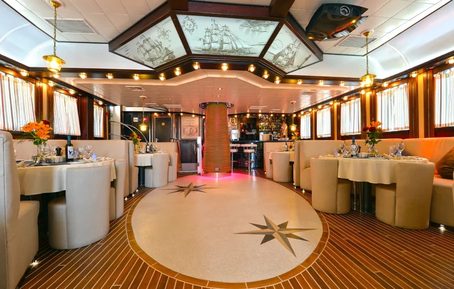 Installé sur le pont supérieur, le restaurant cultive l’ambiance cosy et chaleureuse qui règne sur le bateau par sa décoration Art déco, notamment avec son plafond illustré de gravures de voiliers. On y déguste une gastronomie généreuse et soignée.