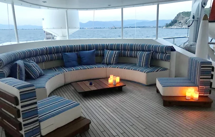 Le clipper est largement ouvert sur la mer et ses espaces extérieurs sont aménagés de transats pour favoriser la détente et la contemplation des paysages cycladiques. Le bain à remous installé sur le pont soleil se transforme en point d’observation du panorama tout en se rafraîchissant. Le bar extérieur quant à lui permet de se désaltérer en humant les embruns de la mer.
