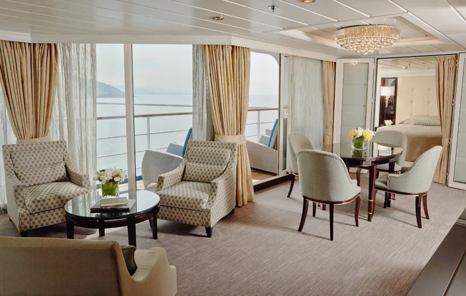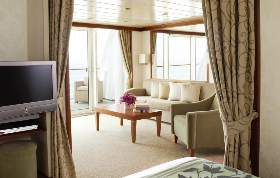 Depuis le balcon en teck de votre élégante suite de 28 à 36 m², vous apprécierez la vue sur le bleu profond des mers ou océans parcourus. Décorées avec finesse et sobriété, les suites invitent à la détente : lit accueillant, grand dressing, salon spacieux… Tout ici reflète le confort. À l’arrivée, une bouteille de champagne vous attendra : vous pourrez la savourer dans votre espace salon ou sur votre balcon privé. À partir de la catégorie Penthouse, vous profiterez de prestations encore supérieures, telles qu’un accès prioritaire aux excursions ou l’assistance d’un majordome pour répondre au moindre de vos souhaits.