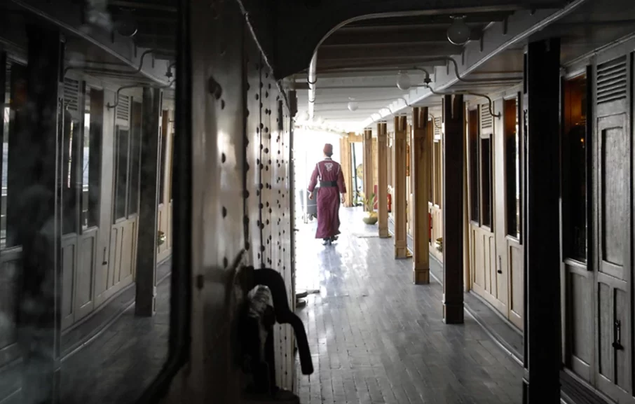 Restaurant élégant dans le style des années 1930 où le personnel porte les costumes du service royal, bar-salon à l’ambiance feutrée, pont supérieur transformé en grande terrasse avec bar panoramique et transats. Service de blanchisserie à bord.