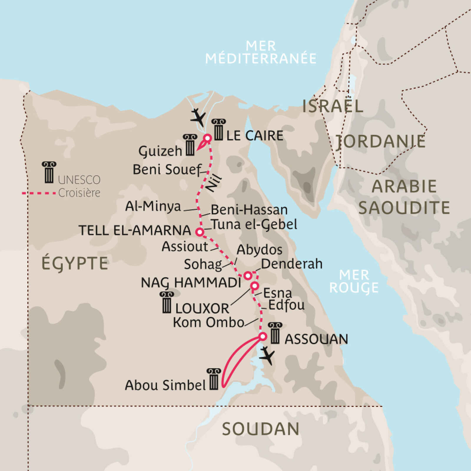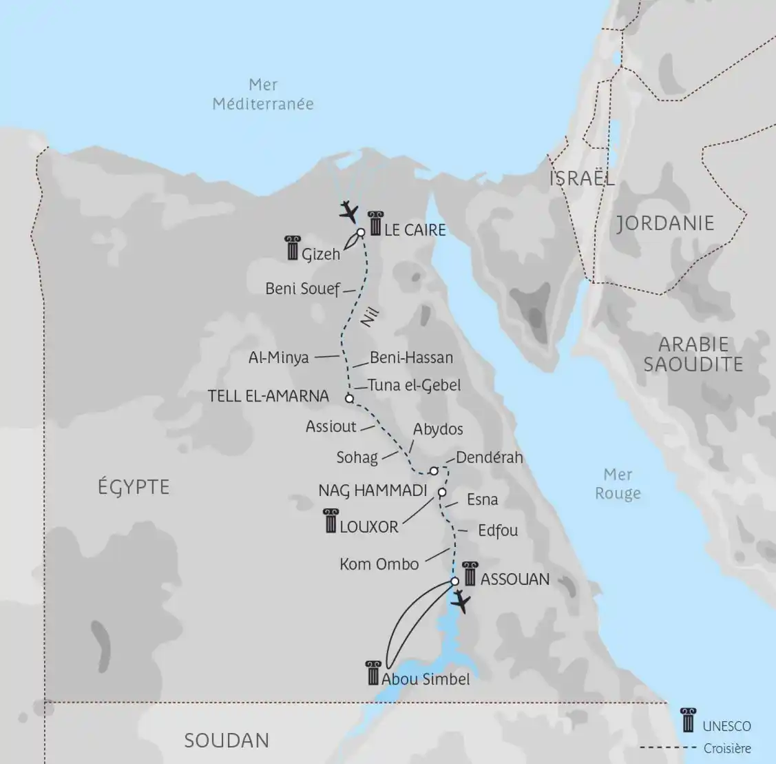 Cette croisière d’exception au fil du Nil vous permettra de découvrir une région d’Égypte inaccessible pour de nombreux voyageurs. Vous foulerez les terres du grand pharaon Akhenaton, père de Toutânkhamon et époux de Néfertiti, qui choisit de quitter Thèbes pour installer son royaume au cœur de la Moyenne-Égypte.