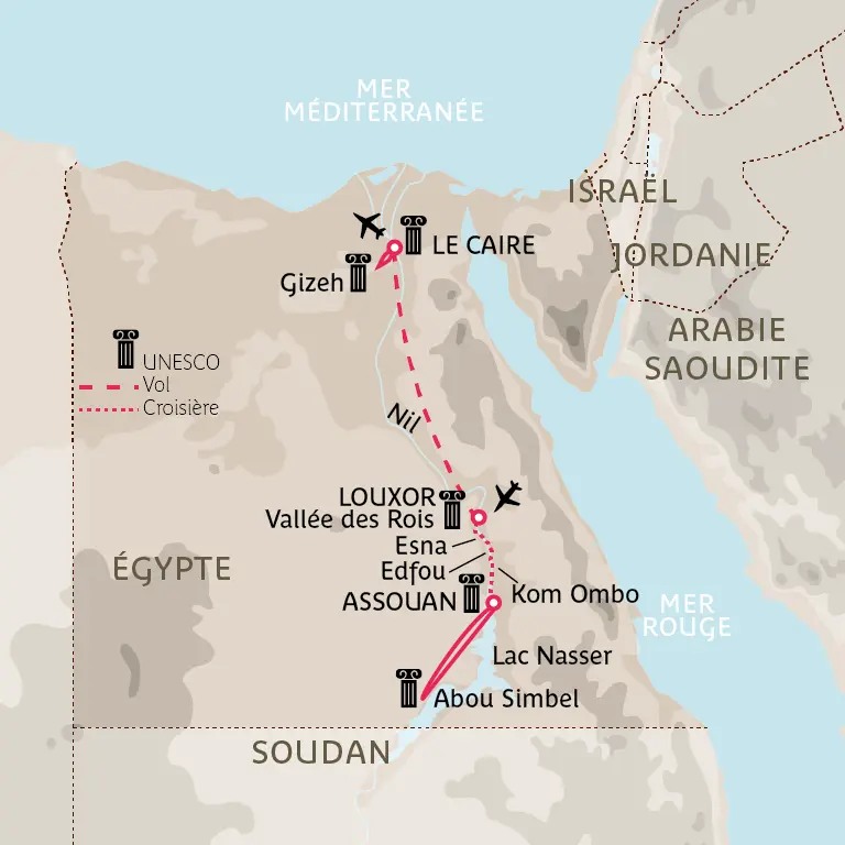Cet itinéraire dense en visites présente l’avantage d’un rythme équilibré avec ses 7 jours de croisière au fil du Nil. Il est idéal pour découvrir en profondeur l’Égypte et ses joyaux éternels. Il débutera par les rives du Nil constellées de vestiges monumentaux et s’achèvera dans l’effervescente capitale où les trésors historiques imposent leur grandeur, sans oublier le majestueux site d’Abou Simbel.