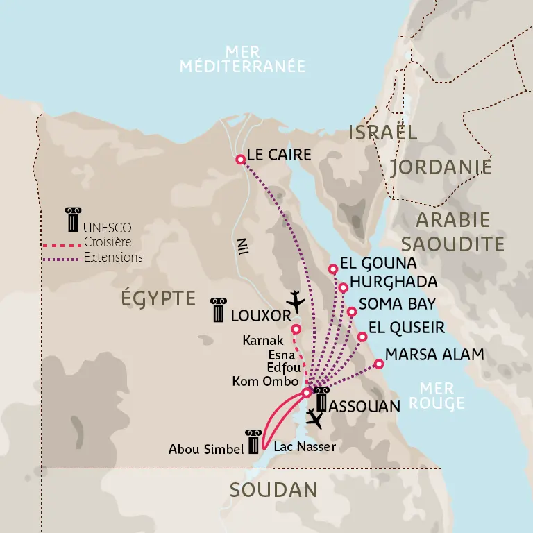 Départ en bus pour Abou Simbel, trésor architectural classé au patrimoine mondial de l’UNESCO. Nés de la volonté de Ramsès II, ces chefs-d’œuvre architecturaux ont été creusés, à l’origine, à même le roc. Pour qu’ils ne soient pas engloutis par la montée des eaux suite à la construction du Haut-Barrage, près de 3 000 personnes travaillèrent trois ans durant sous l’égide de l’UNESCO pour les découper en immenses blocs… et les remonter dans leur orientation initiale 65 mètres plus haut, accolés à une colline artificielle. Retour à Assouan et transfert à l’hôtel. Déjeuner et après-midi libres. Dîner et nuit à l’hôtel.