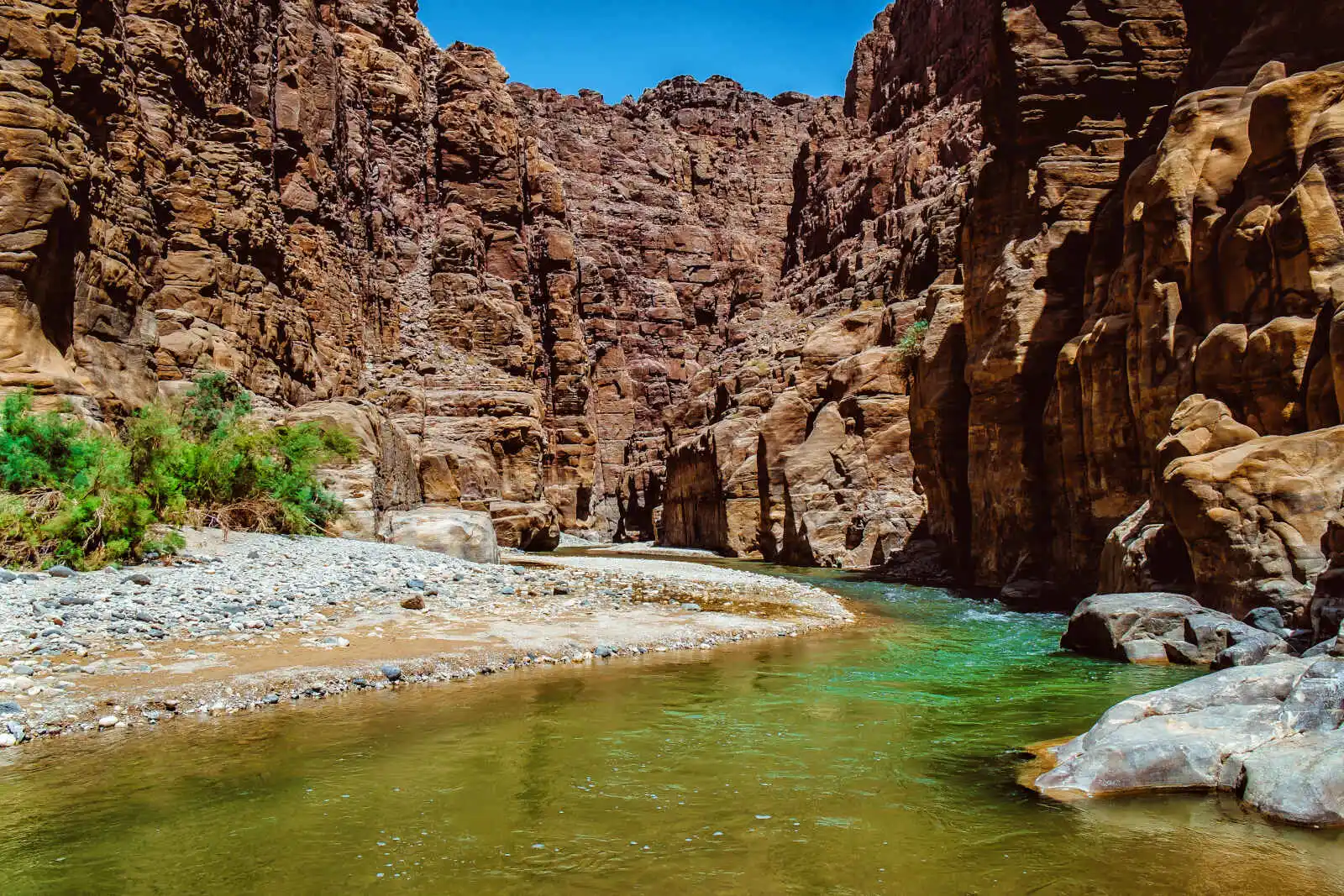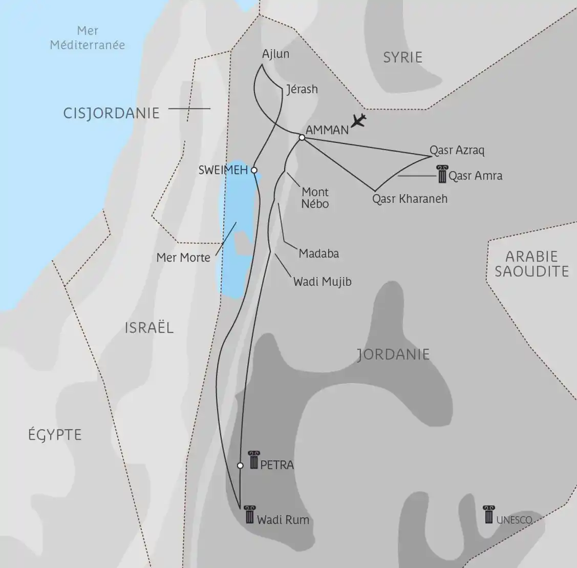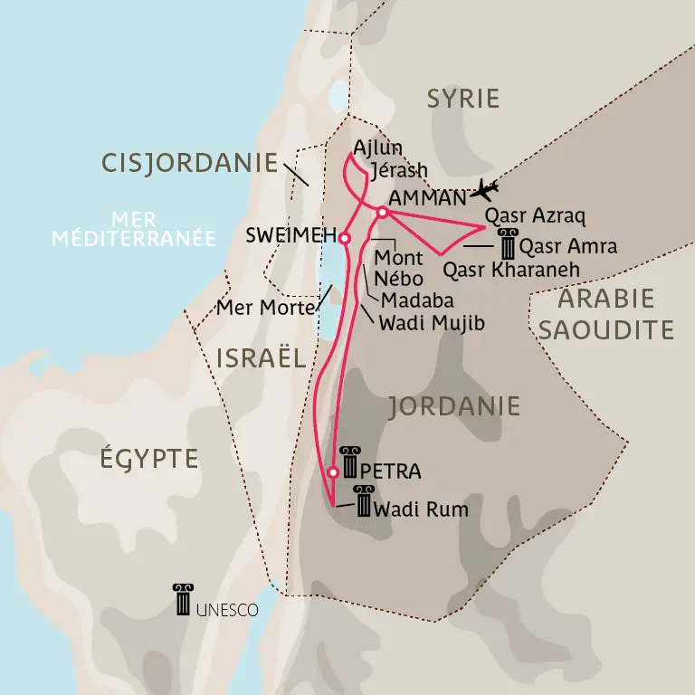 Journée consacrée à la visite de Petra. Émergeant d’un cirque naturel cerné de falaises, Petra, sculptée à même les parois de grès rose et ocre, resplendit. Ce site, habité depuis la préhistoire, fut, dès le IIe siècle avant J.-C., la capitale des Nabatéens, grands commerçants qui y échangeaient encens, soieries et épices. Ses impressionnants monuments tantôt construits en pierre, tantôt sculptés dans la roche figurent sur la liste du patrimoine mondial de l’UNESCO depuis 1985. Vous entrerez sur le site par l’étroit et sinueux défilé du Sîq, encaissé entre deux falaises hautes de 100 m, qui dévoile peu à peu les majestueux vestiges de quelques 600 monuments taillés dans la pierre. Découverte du célèbre temple Khazneh ou « trésor du pharaon », l’une des façades les plus grandioses de Petra, puis des tombeaux royaux et de l’imposant monastère d’Ed Deir, taillé à même la roche de grès jaune. Déjeuner sur le site. Dîner et nuit à l’hôtel.