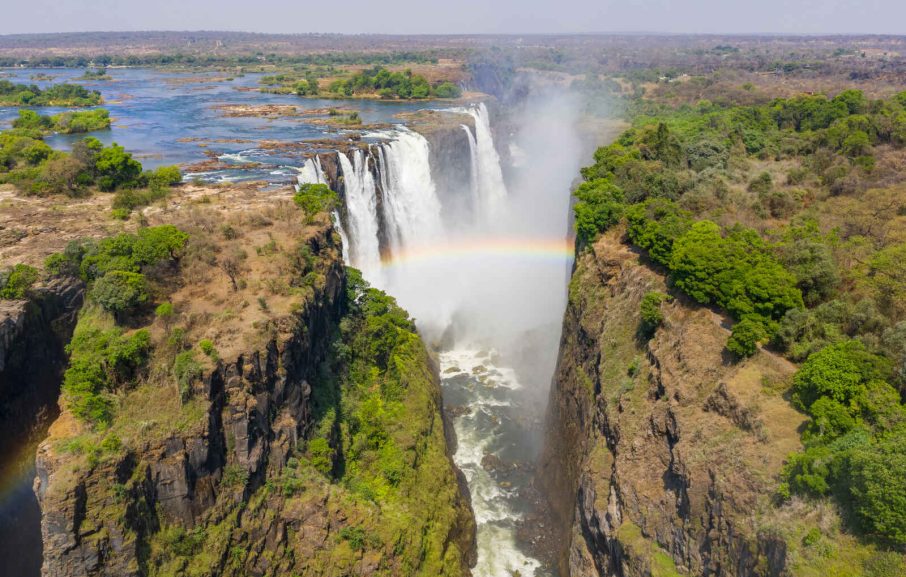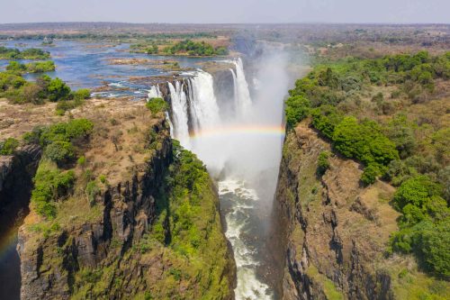 Après une longue traversée de l’Afrique australe de près de 2 660 km, le fleuve Zambèze aboutit aux chutes Victoria. Les eaux du fleuve plongent dans de profondes gorges en produisant un fracas assourdissant. Un spectacle grandiose !