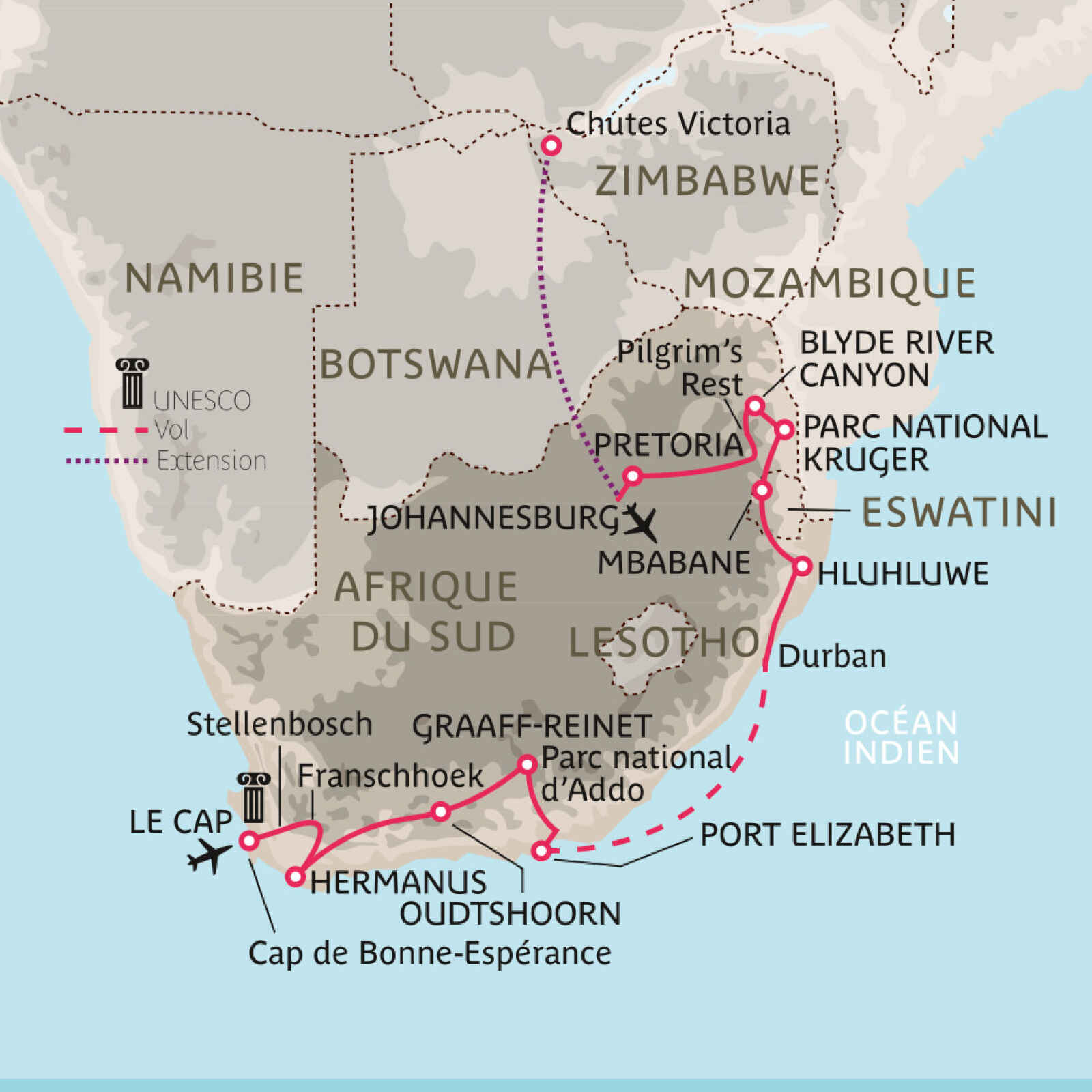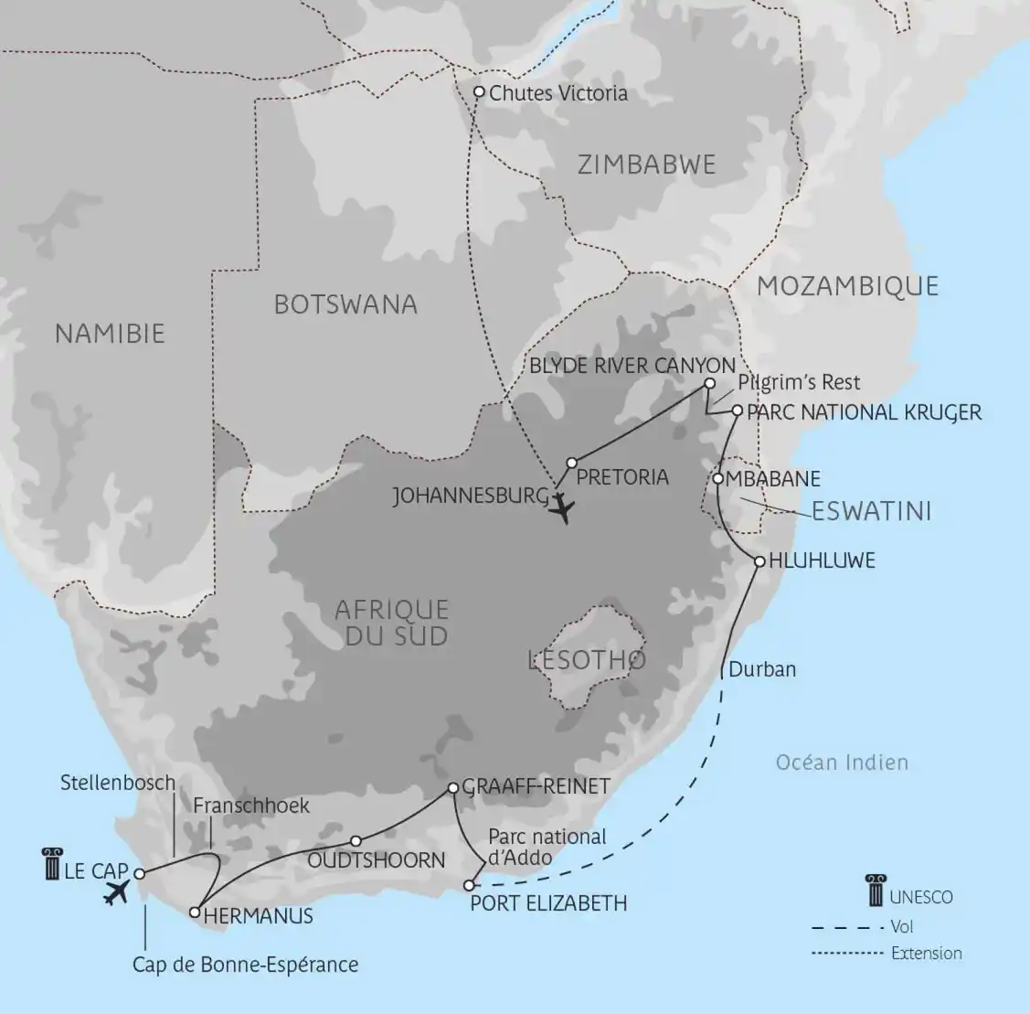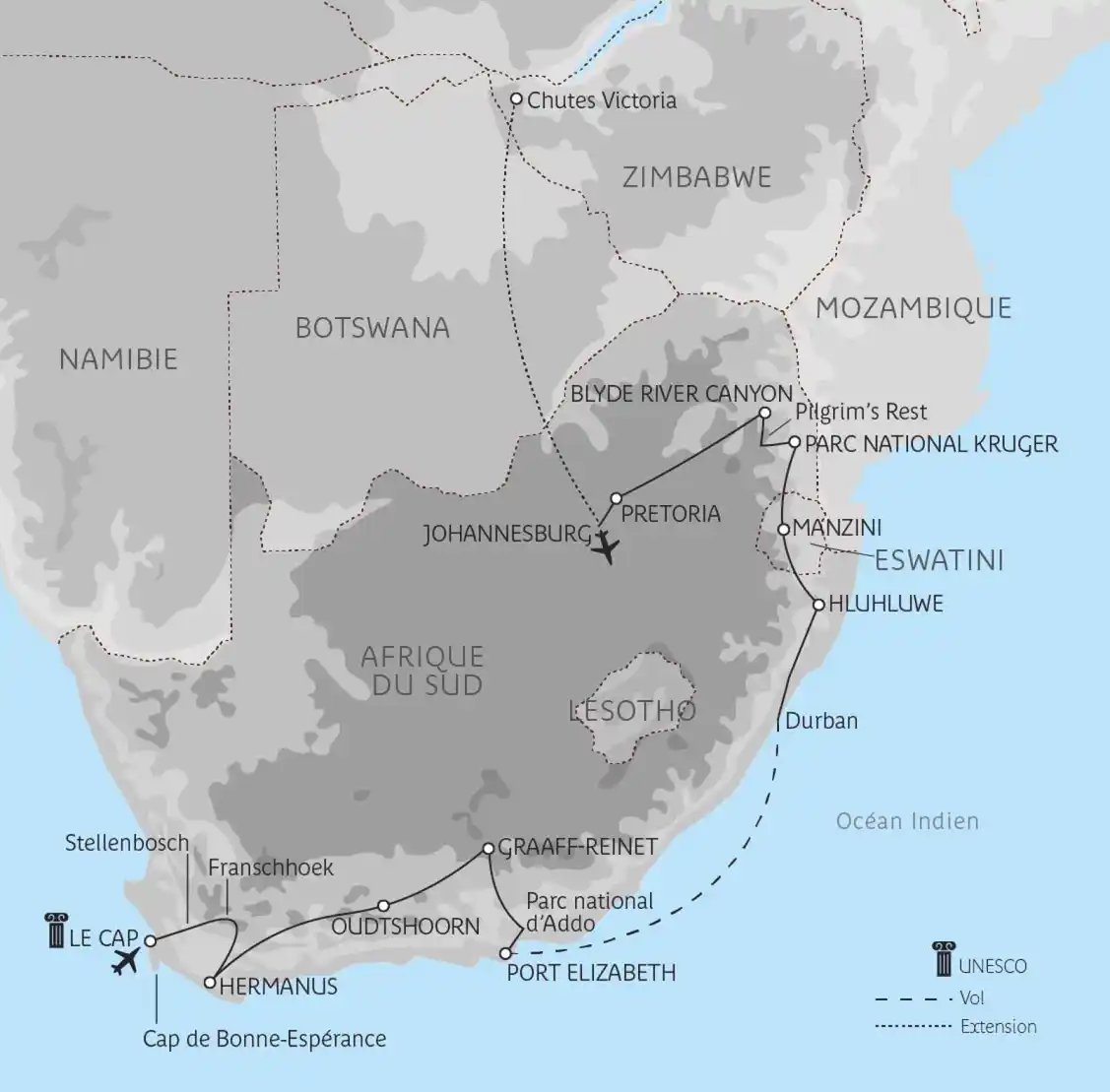 Cette belle aventure australe vous invite dans les plus riches réserves animalières sud-africaines : le parc d’Addo dans le sud, Hluhluwe en pays zoulou, le parc Kruger dans le nord... Vos découvertes, activités et rencontres vous feront vivre au rythme des peuples de l’Afrique du Sud et d’Eswatini, l’ex-Royaume du Swaziland.
