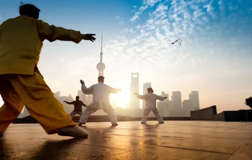 Pratique du taiji, Tour de la perle orientale en arrière-plan, Shanghai, Chine