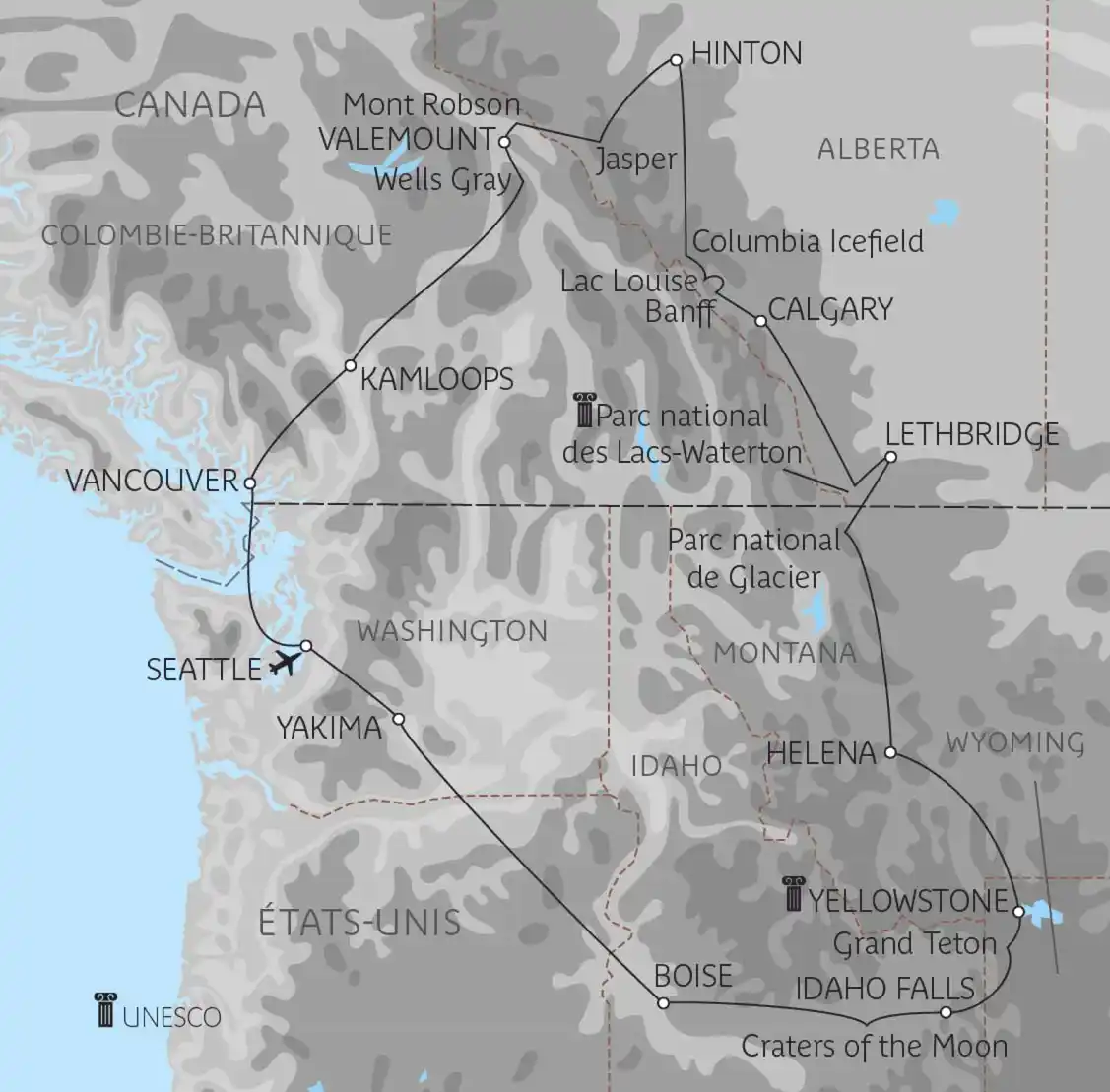Profitez d’un combiné inédit qui allie l’Ouest canadien et le Nord-Ouest américain. La nature y est à l’honneur, avec la découverte de sept parcs aux panoramas tous plus époustouflants les uns que les autres. Des paysages variés défileront sous vos yeux : hautes montagnes, forêts, lacs, cascades, canyons, glaciers, sources chaudes, geysers, mais aussi des étendues de lave. Une faune nombreuse croisera également votre chemin : ours, bisons, orignaux, wapitis...