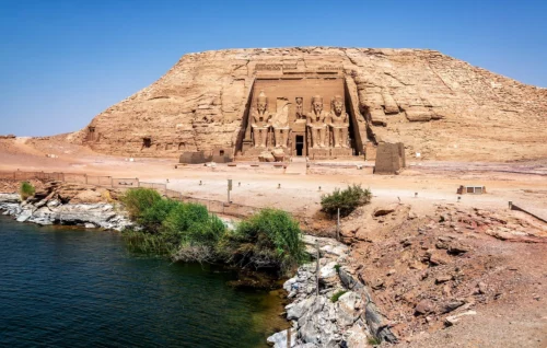 Vue du temple d'Abou Simbel et de la rive du lac Nasser en Egypte