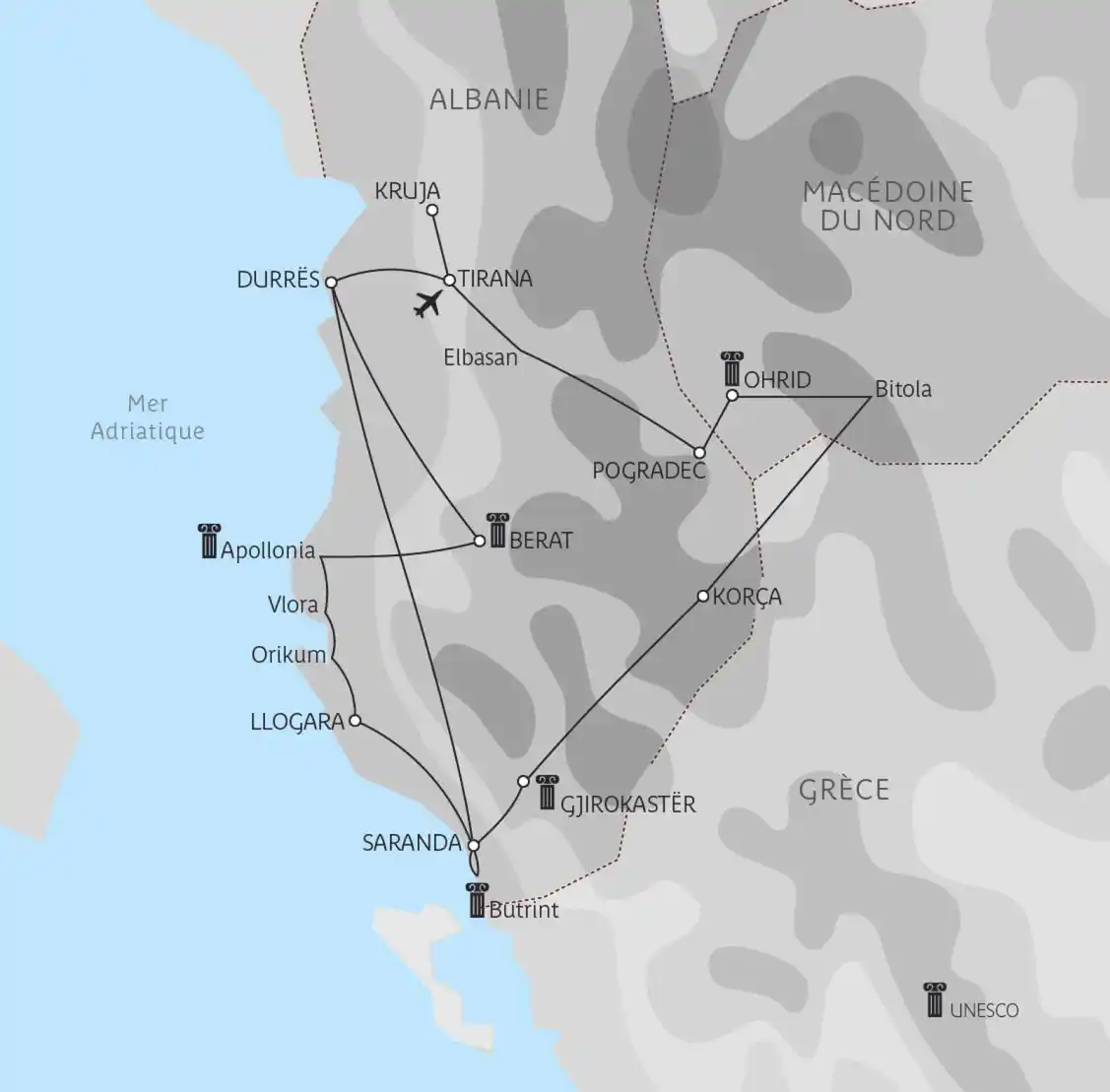 Visite de Kruja et de son château puis balade à travers ses ruelles pittoresques. Perchée sur les hauteurs, Kruja est surnommée « le balcon de l’Adriatique ». Elle est également connue pour être la ville natale du héros national Skanderberg. Route pour Tirana et découverte de la ville : le boulevard Dëshmorët e Kombit, la place Skanderbeg, le Musée national, la mosquée Et’hem Bey, la cathédrale. Déjeuner puis continuation pour Durrës. Visite de l’amphithéâtre, du Musée archéologique et balade autour de la tour vénitienne. Dîner de produits de la mer et nuit à l’hôtel.