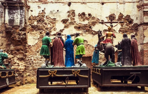 Chars représentant des stations de la Passion du Christ en vue des célébrations de la Semaine Sainte, Guatemala