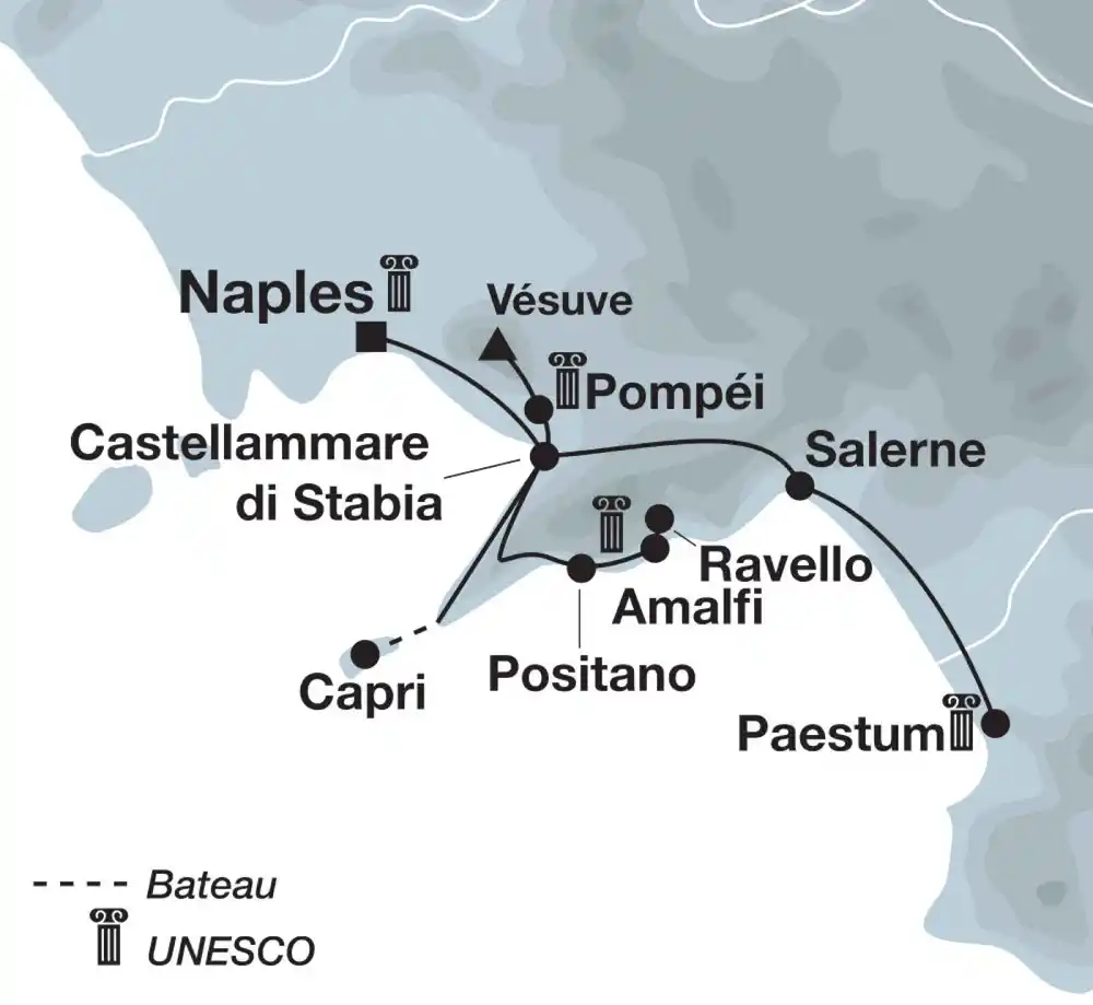 De la plus belle baie du monde au sublime Vésuve, des villes antiques figées en plein mouvement en passant par les palais baroques aux étonnantes mosaïques jusqu’aux îles enchantées de la côte amalfitaine dignes d’un paradis retrouvé, c’est un voyage dans les siècles qui vous attend, où mille parfums viendront éveiller vos rêves les plus chers.