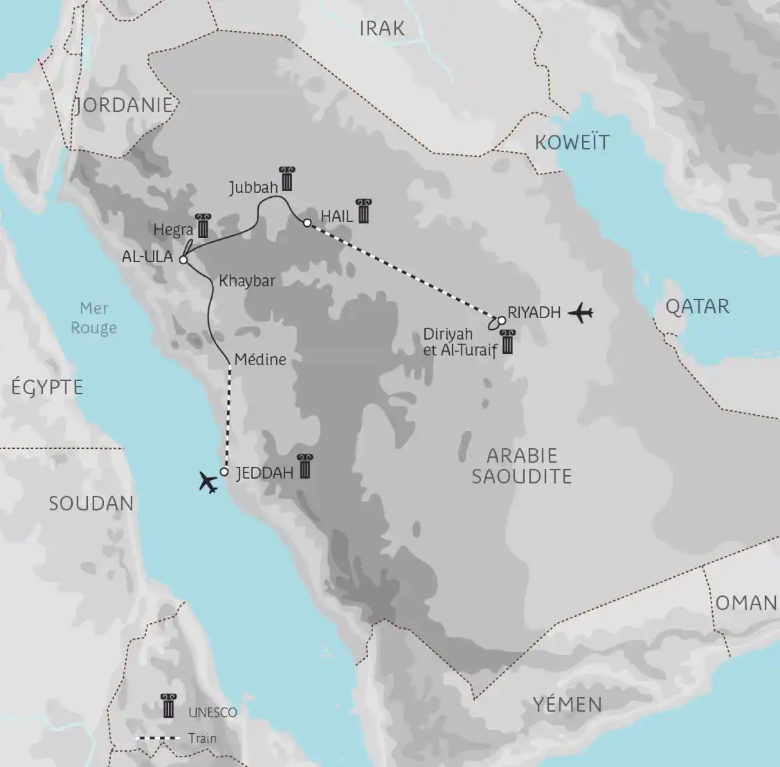 Berceau de la mystérieuse civilisation nabatéenne, l’Arabie saoudite dévoile au monde ses trésors archéologiques et culturels. De la skyline futuriste de Riyad aux rives de Jeddah sur la mer Rouge, vous parcourrez des siècles d’histoire à ciel ouvert. L’exceptionnel site d’Al-Ula, les sépultures insolites d’Hegra au cœur du désert, les ruines du quartier d’Al-Turaif datant du XVe siècle sont autant de témoignages d’une histoire légendaire, plusieurs fois millénaire, qui révèle peu à peu ses secrets.