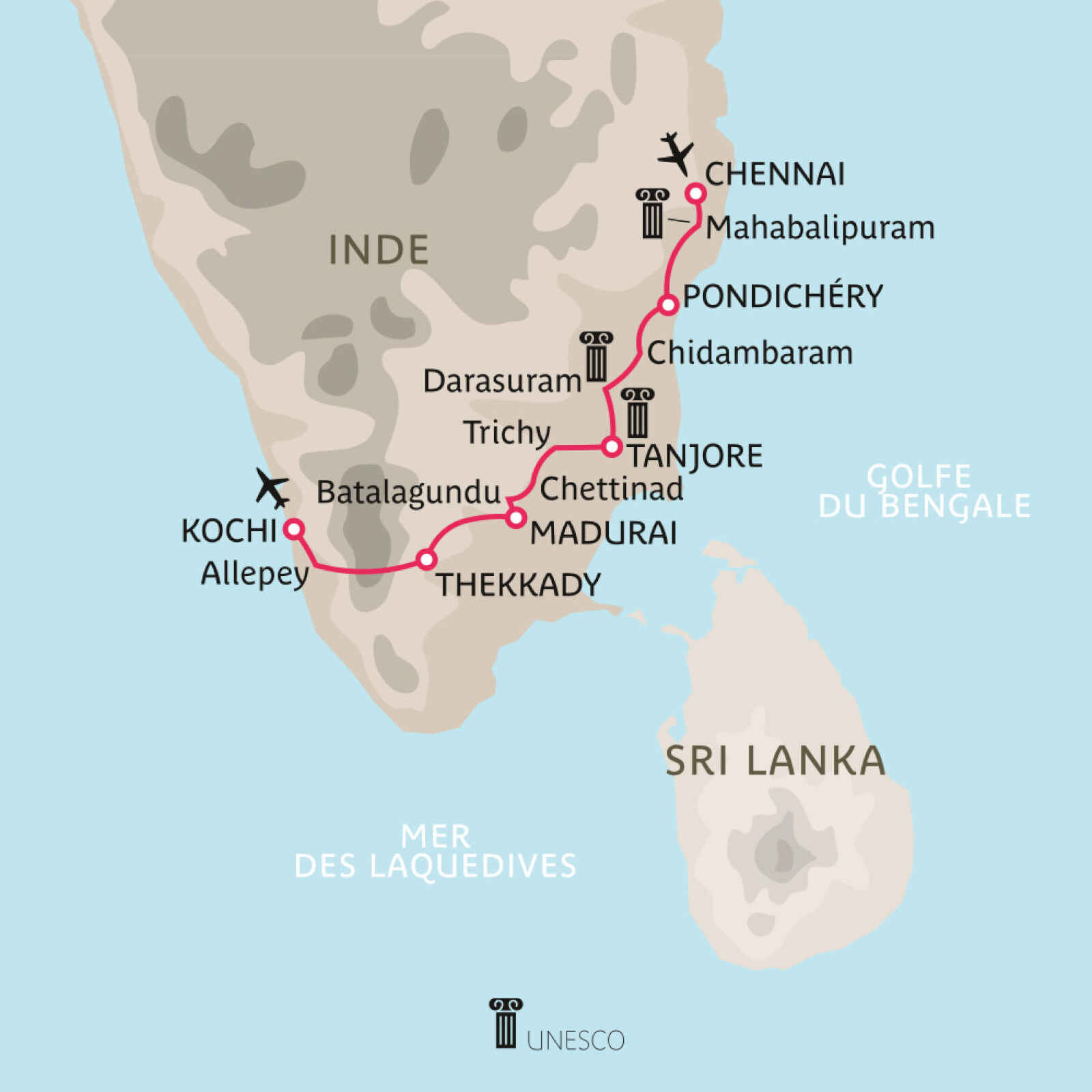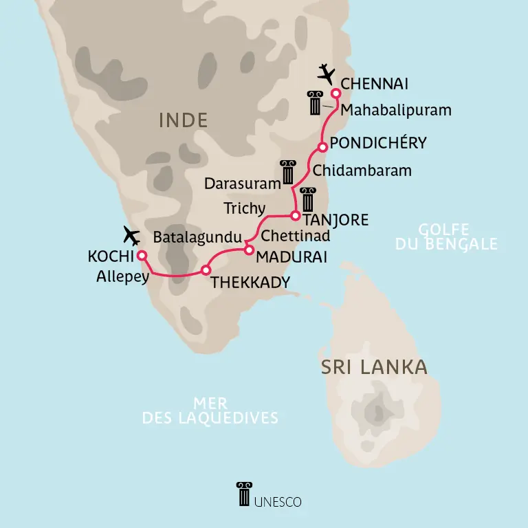 au travers de haltes dans ses anciens comptoirs britanniques, français et portugais ; à Chettinad lors de visites de palais qui furent construits par de riches marchands au XIXe siècle.