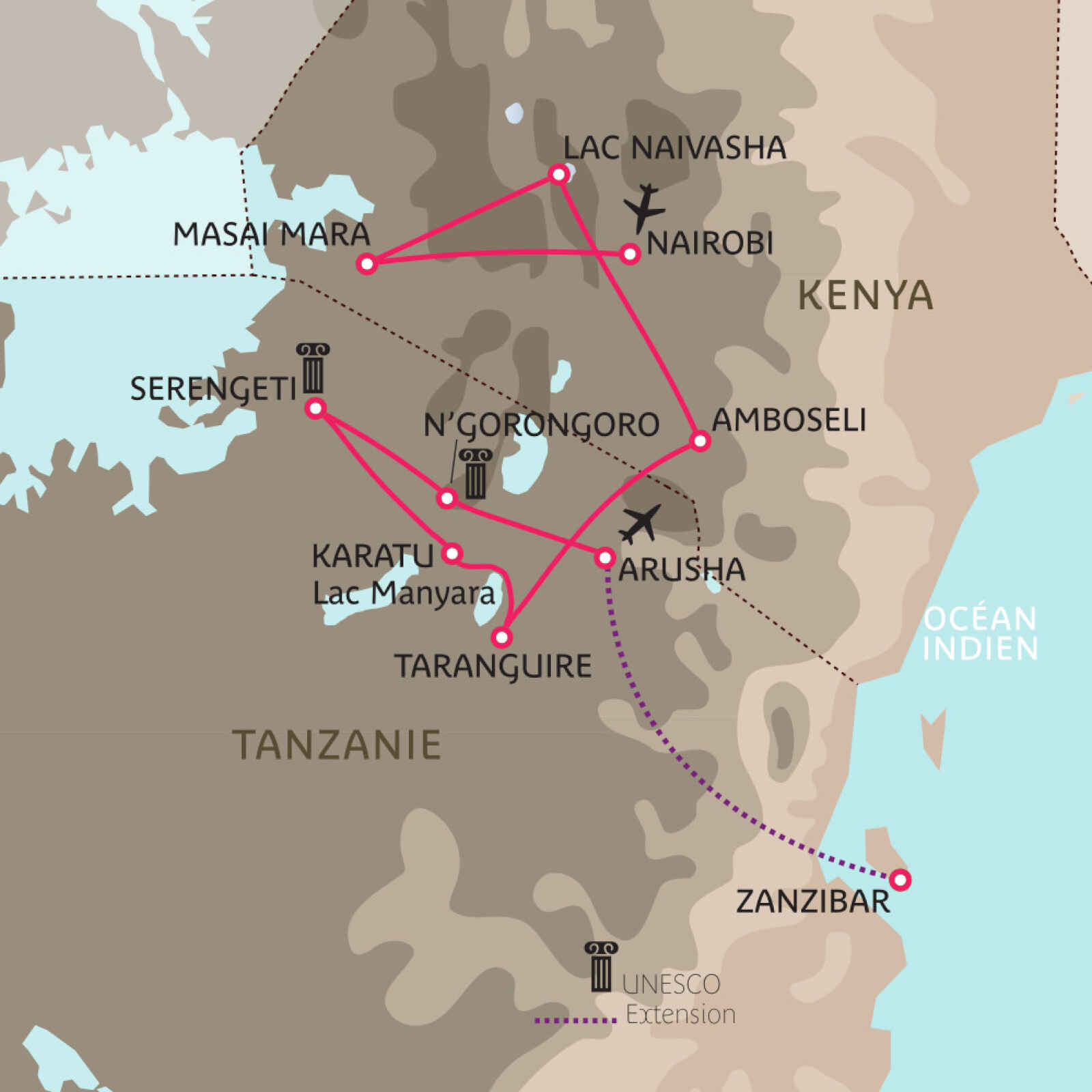 En privatisant ce circuit, vous partirez en compagnie de vos proches et de voyagerez en voiture privée avec chauffeur-guide. Des conditions idéales pour un safari ! À l’ombre du majestueux Kilimandjaro, entre savanes infinies et terres ancestrales, partez à la rencontre de la faune sauvage dans les plus belles réserves du Kenya et de la Tanzanie. Lions, éléphants, girafes… observez les animaux dans leur habitat naturel. Séjournez dans des lodges au cœur de la brousse, au plus près des grands espaces pour une échappée dans ce que la nature offre de plus beau. Puis, prolongez votre périple par un séjour sur les plages dorées de Zanzibar, entre lagons turquoise et sable chaud.
