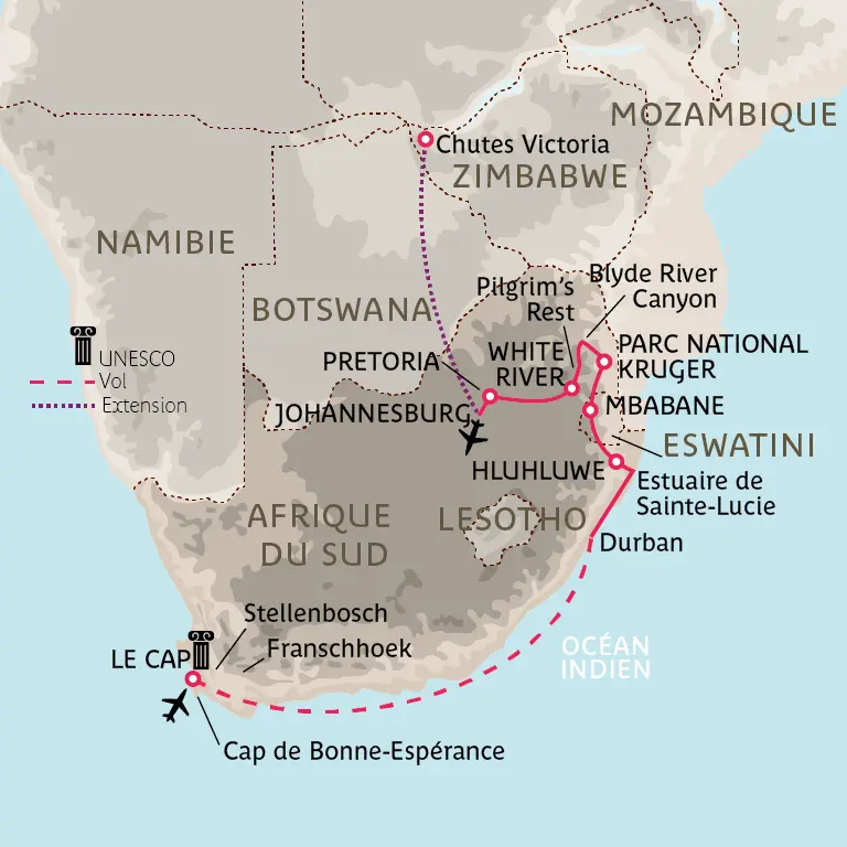 Explorez les multiples facettes de l’Afrique australe, entre ville vibrante comme Le Cap, paysages spectaculaires du cap de Bonne-Espérance au Blyde River Canyon, safaris au parc Kruger et rencontres culturelles en Eswatini. Un monde en un seul pays, telle est la devise de cette contrée aux antipodes !