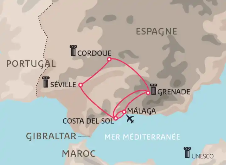 Grenade et l’Alhambra, Cordoue et sa mosquée-cathédrale, Séville et l’Alcazar.