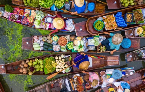 Départ matinal pour découvrir le marché de Mae Klong qui présente l’originalité d’être installé sur une voie ferrée, traversée par un train 8 fois par jour. À chaque signal d’approche du train, et en moins de 2 minutes, les voies se vident. Route pour rejoindre le célèbre marché flottant de Damnoen Saduak pour une promenade en pirogue traditionnelle le long des canaux bordés de maisons sur pilotis et petites échoppes. Vous y découvrirez un lieu de vie unique, où les habitants se déplacent encore en barque. Retour dans la capitale et déjeuner typiquement thaï. Dans l’après-midi, excursion en bateau sur les klongs, célèbres canaux situés dans le quartier flottant de Thonburi. Visite du Wat Arun, le temple de l’Aurore, véritable chef-d’œuvre de l’art religieux renaissant du Siam, reconnaissable à son élégante tour de style khmer ornée de porcelaines colorées. Dîner libre. Nuit à l’hôtel.