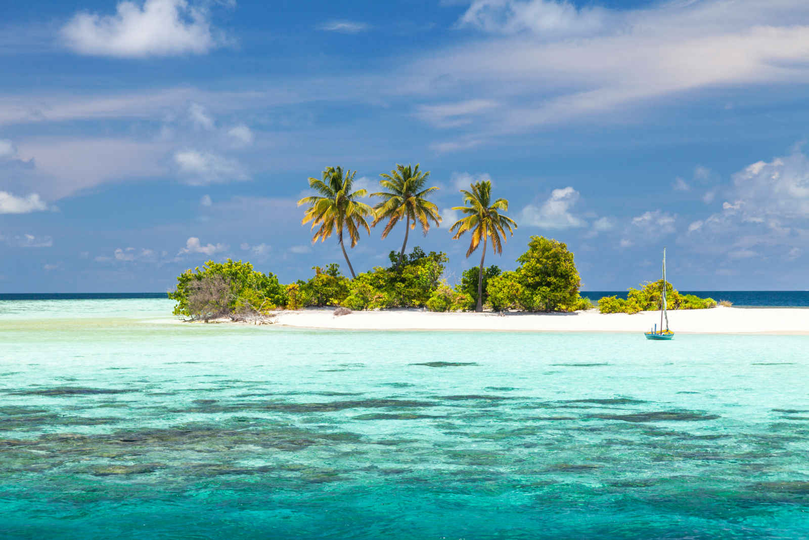 Ile déserte, palmiers et bateau traditionnel, Maldives