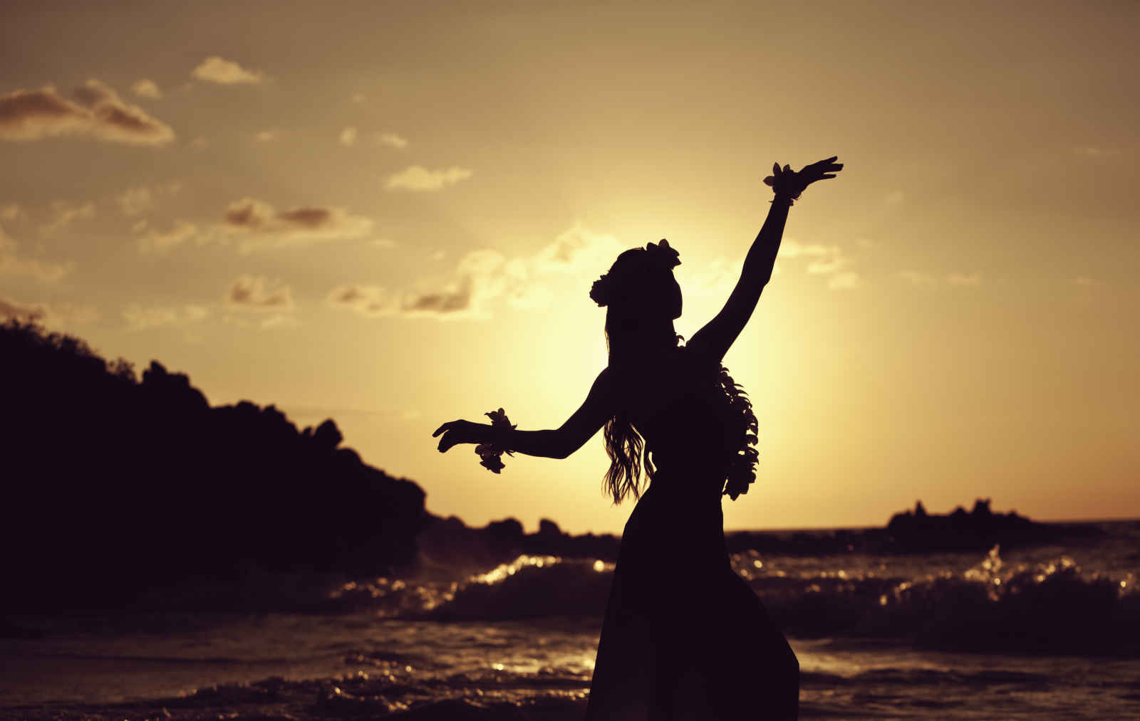 Danseuse en contre-jour au soleil couchant, Polynésie française