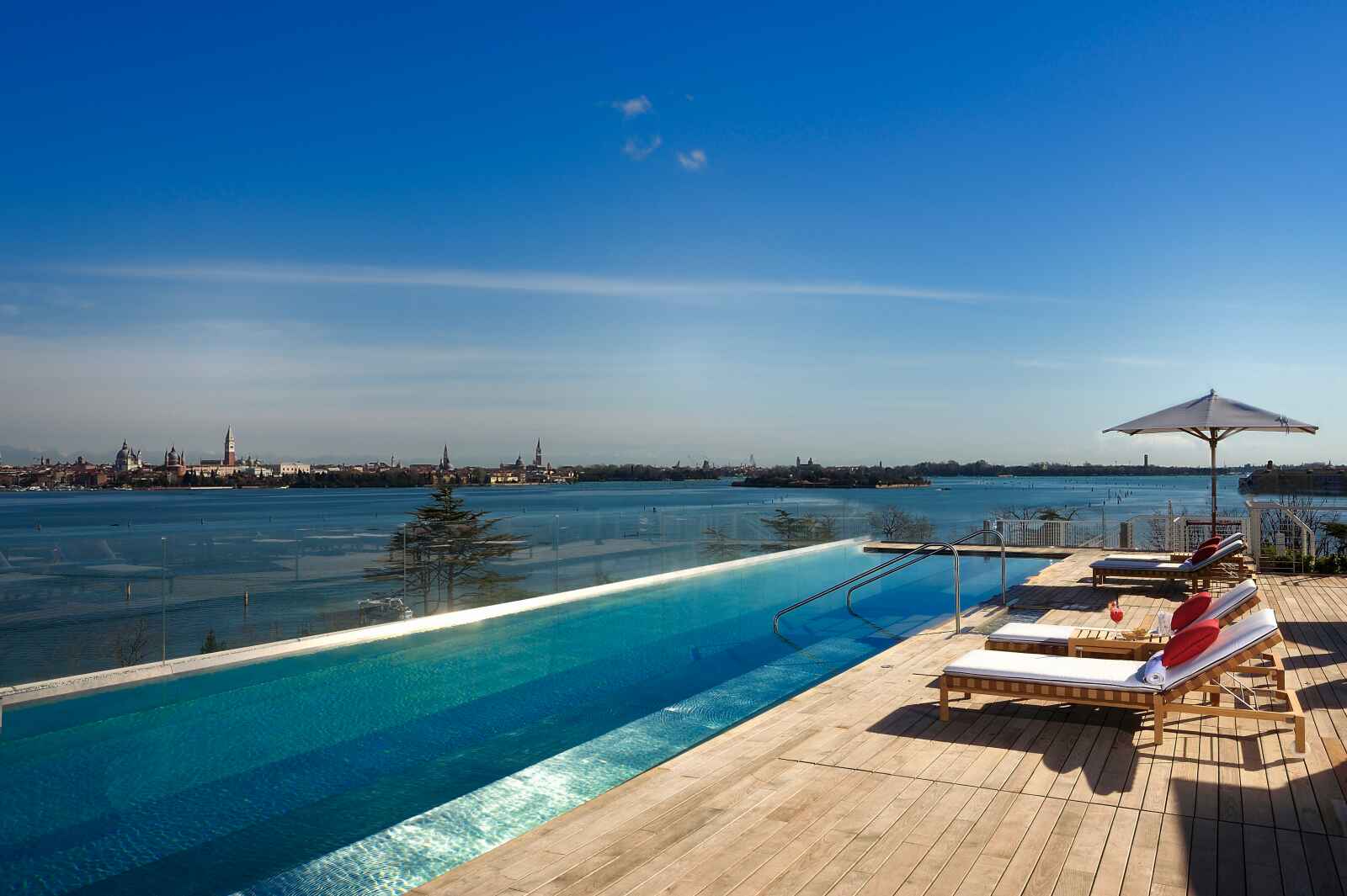 Une piscine à débordement sur le toit avec vue sur Venise, deux piscines famille dans le jardin dont un bassin dédié aux enfants, et une piscine pour les clients du Spa.