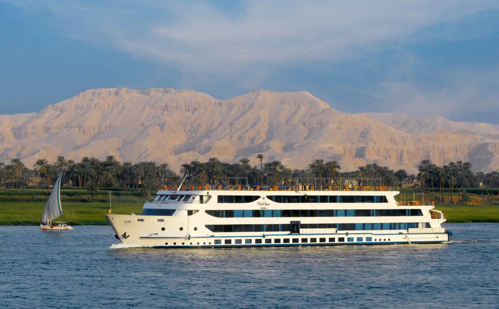 Construit en 2006, ce bateau de croisière, d’une longueur de 72 m et d’une largeur de 14,4 m, arbore 5 ponts dont l’un accueille une piscine – idéal pour voir les paysages défiler –, et peut recevoir jusqu’à 56 passagers maximum. Il s’agit sans doute, avec son style tendance déclinant bois sombre, métal et verre, du navire le plus luxueux voguant sur le Nil. Il dispose toujours de son propre quai d’amarrage.
